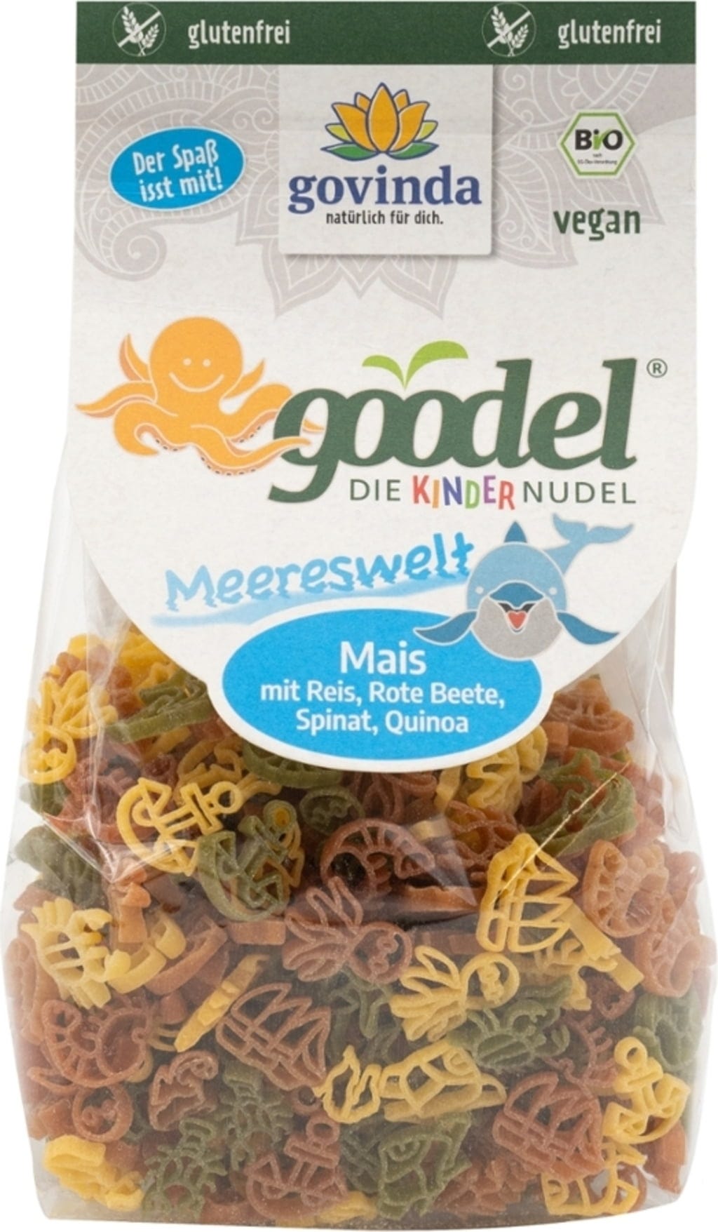 Kinder-Goodel „Meereswelt“ från Govinda bjuder på färgglad pastaglädje i form av havsdjur. Tillverkad i italiensk manufaktur ger den milda basen av majs och ris en fin smak som naturligt kompletteras med rödbeta, spenat och quinoa. Pastan torkas varsamt, är glutenfri och ger en klassisk al dente-känsla. Ett medvetet val för en varierad kost i familjeköket.