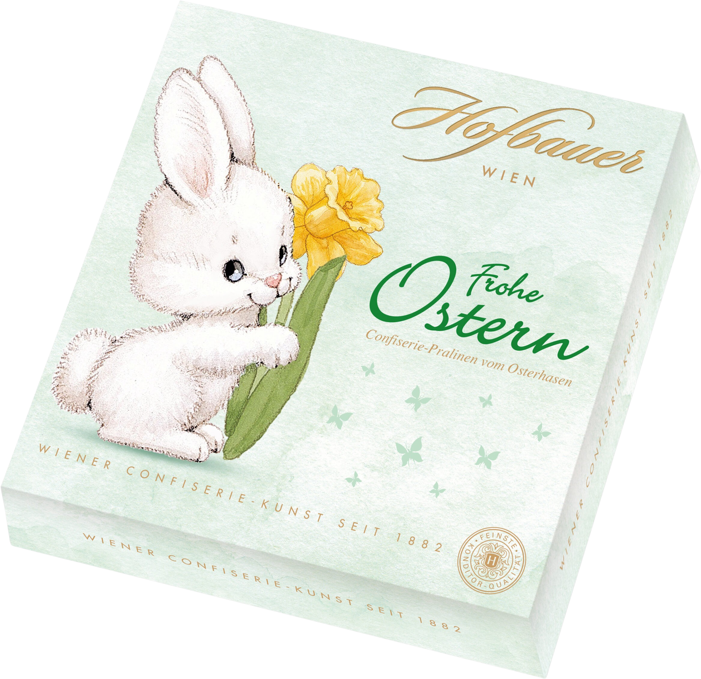 Med "Glad Påsk"-utgåvan från Hofbauer kan du njuta av den finaste wienska konfektyrkonsten i dess vackraste form. Du kan se fram emot choklad som har förädlats för dig med precisionshantverk och stor uppmärksamhet på detaljer. I förpackningen hittar du tre olika, kärleksfullt utformade påskdesigner som ger variation i både utseende och smak!