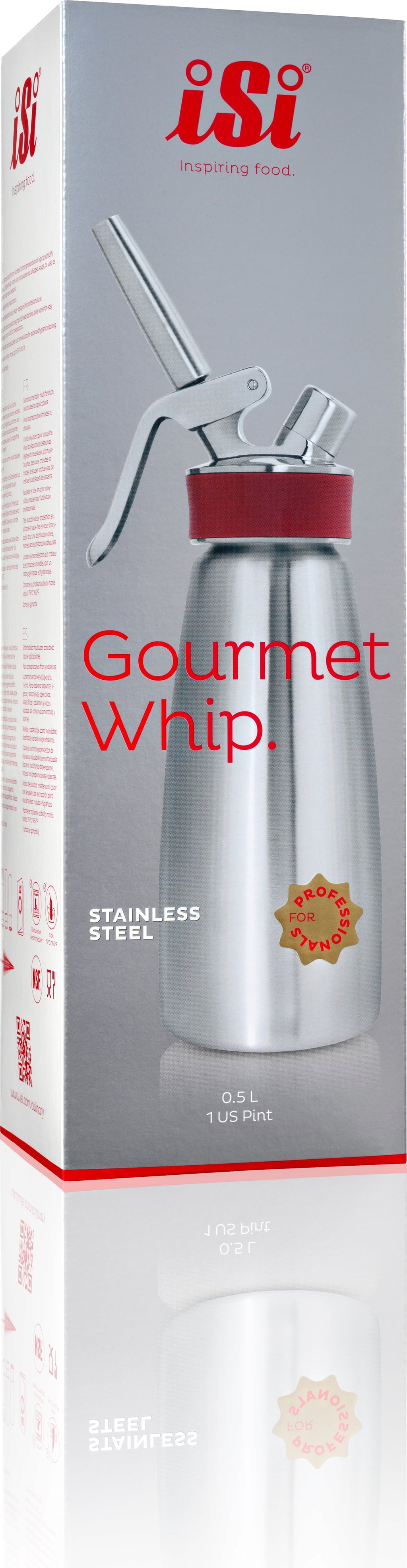 Gourmet Whip, tillverkad av högkvalitativt rostfritt stål, kan användas för varma & kalla såser, soppor, desserter eller till och med espumas. När produkten kombineras med de matchande tillbehören är otaliga andra användningsområden möjliga. Marinering, fyllning, dekoration och smaksättning - allt detta är enklare än någonsin med hjälp av iSi Gourmet Whip!