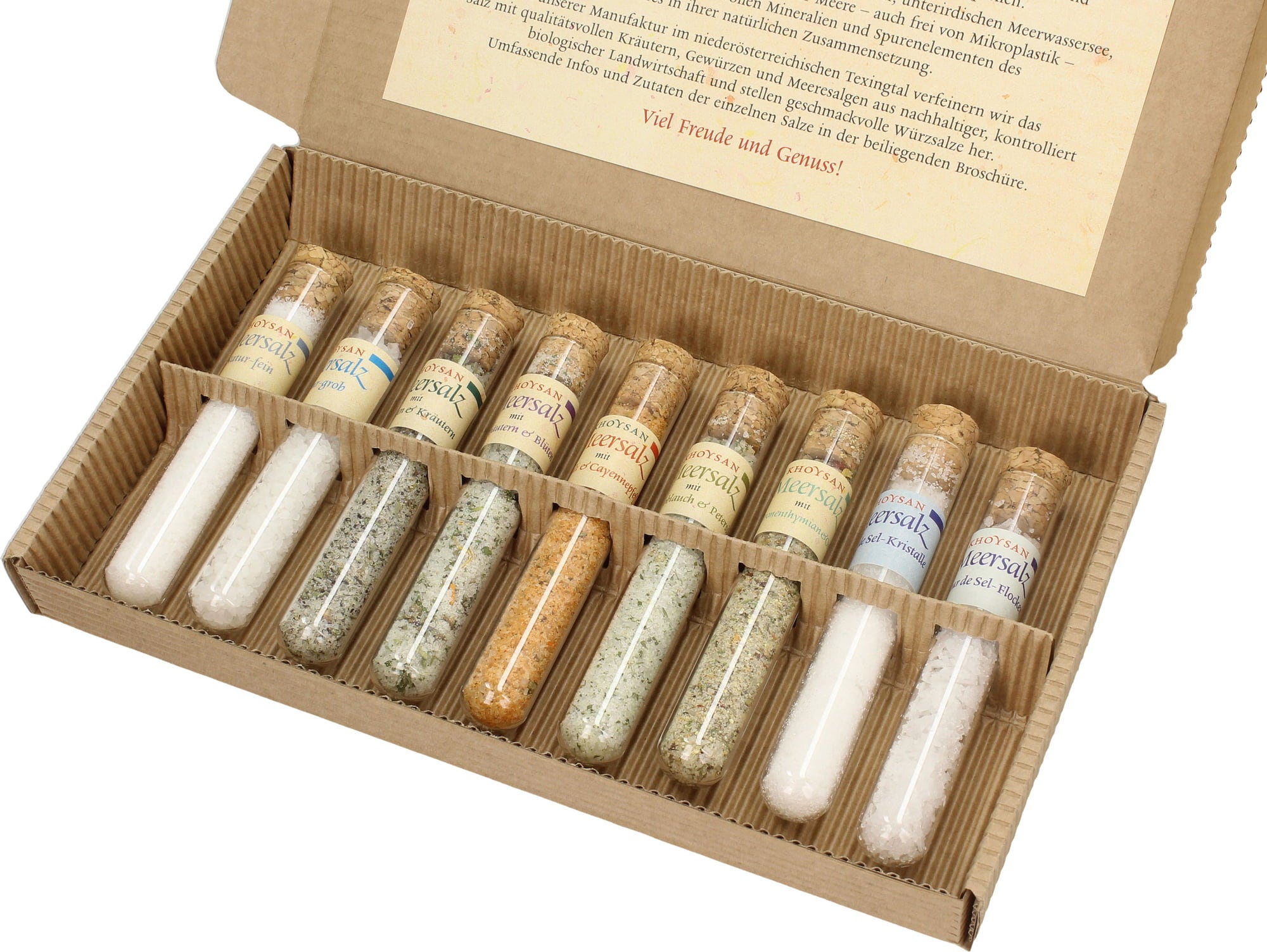Perfekt för nybörjare – innehåller smakprov av alla Khoysans havssalter, förpackade plastfritt i glasampuller.
