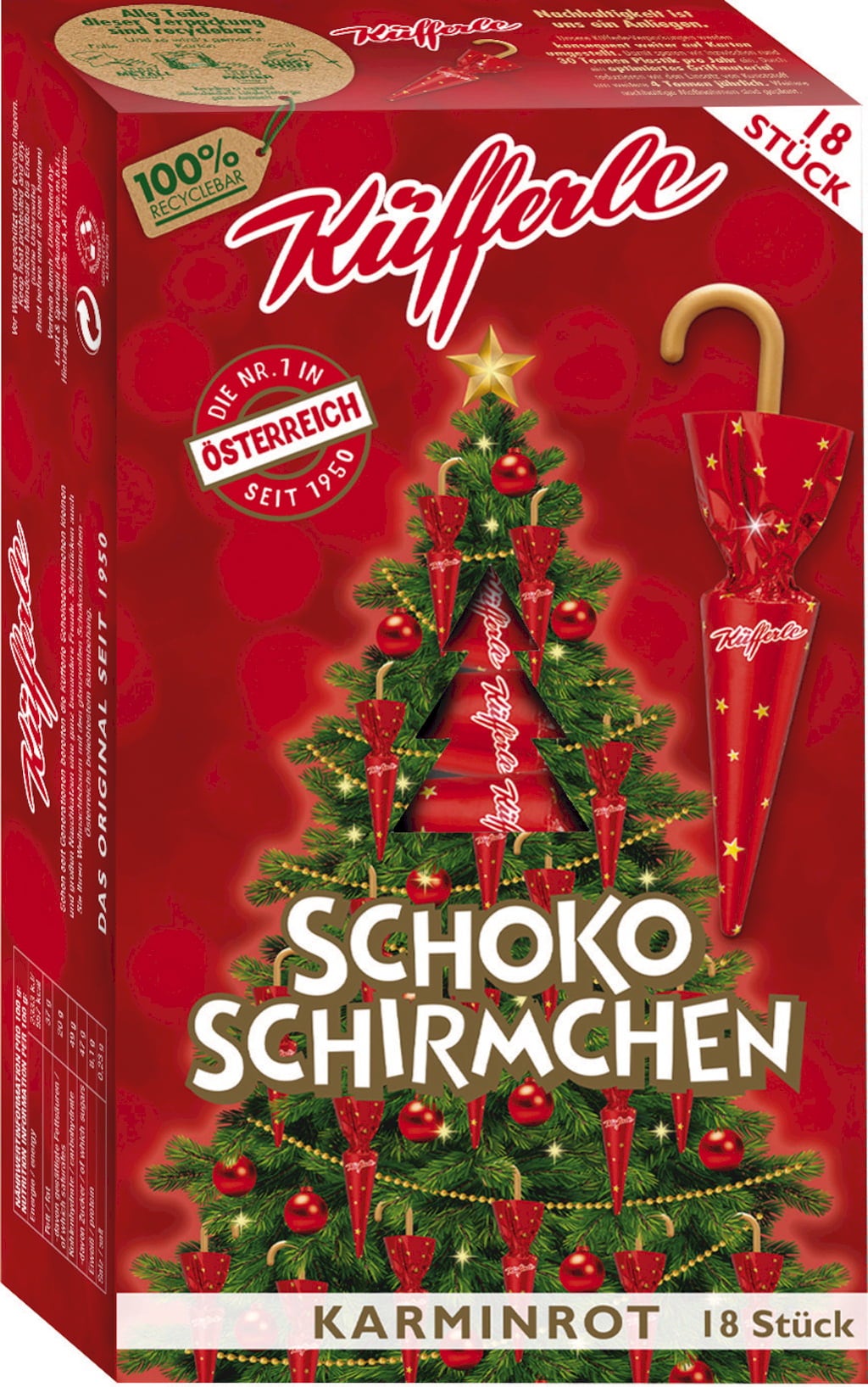 Küfferle chokladparaplyer i en julig design förvandlar varje julgran till ett riktigt mästerverk. Paraplyerna av den mjukaste mjölkchokladen är ett riktigt blickfång och smakar gott för både små och stora chokladtigrar.