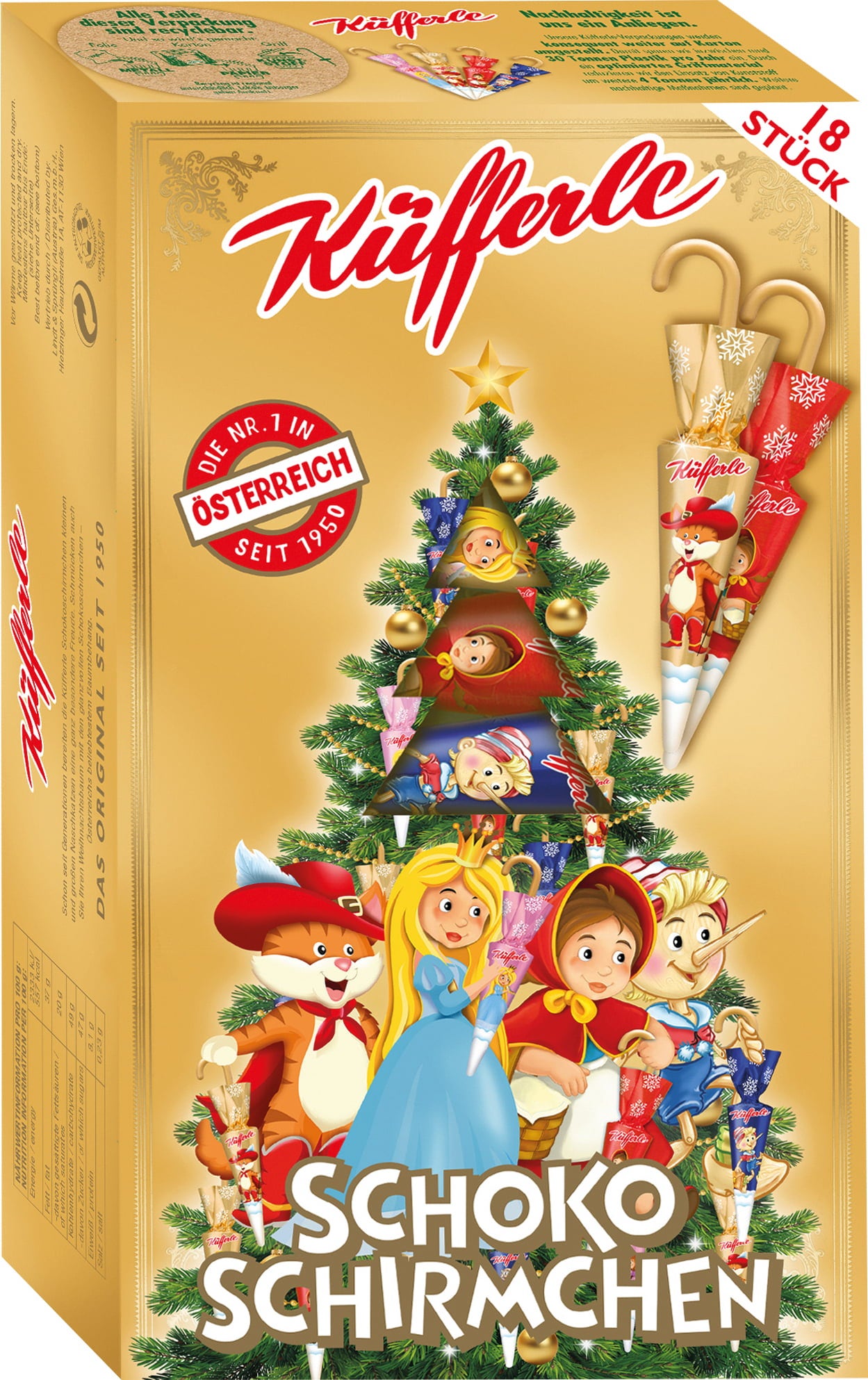 Chokladparaplyerna från Küfferle är alla tiders bekanta följeslagare i julgranen och glädjer inte bara de yngsta familjemedlemmarna. Hjärtliga och chokladiga som alltid och med illustrationer av de populära sagofigurerna från Rödluvan, Askungen, Mästerkatten i stövlar och Pinocchio.