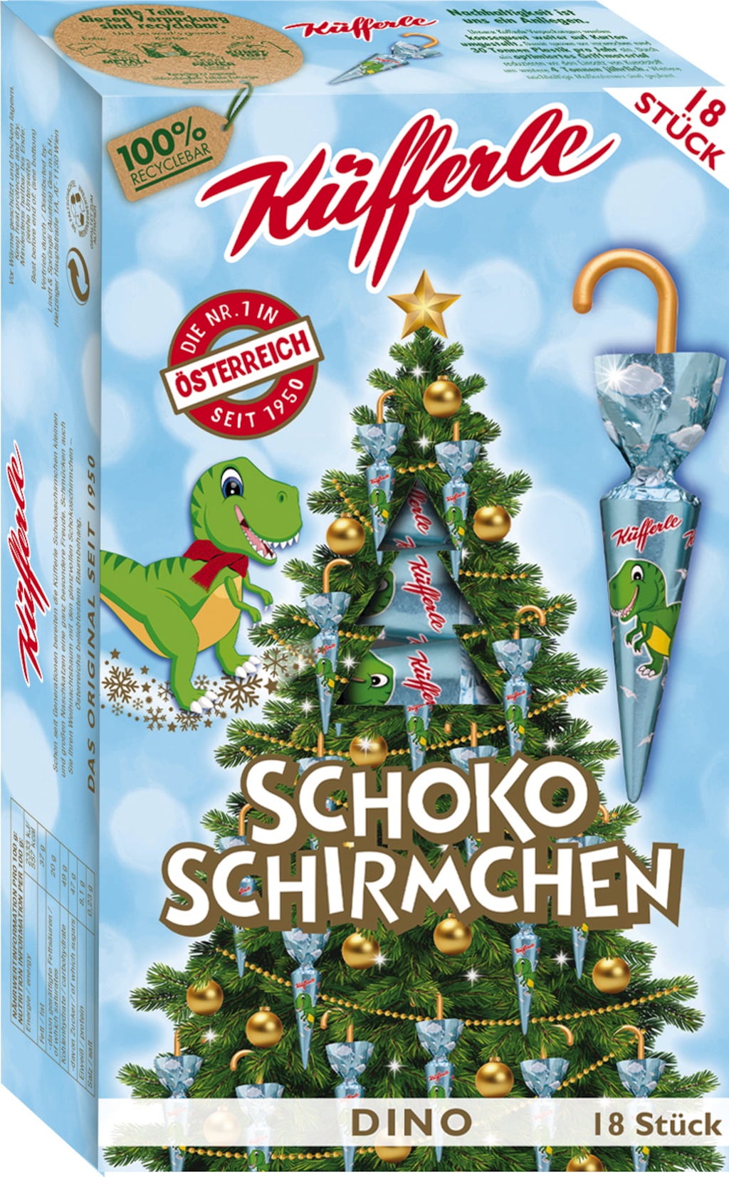 Jul med en skillnad - varför inte? Dekorera din julgran i år med Küfferle dinosaurier. En förpackning innehåller 18 av de populära mjölkchokladparaplyerna med finmalda hasselnötter. Låt fantasin flöda och känn dig som i ett land före tiden. Lekfull jul med en touch av fantasi, vad kan vara trevligare?