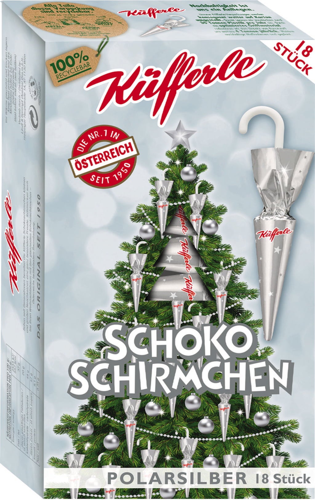 Glädje kommer med denna fantastiska trädhängning! Förtrollande gnistrande i festligt polarsilver på utsidan och oemotståndligt smältande mjölkchoklad på insidan, som Küfferle har varit känd för i generationer. Med dessa paraplyer blir julen garanterat en fest.