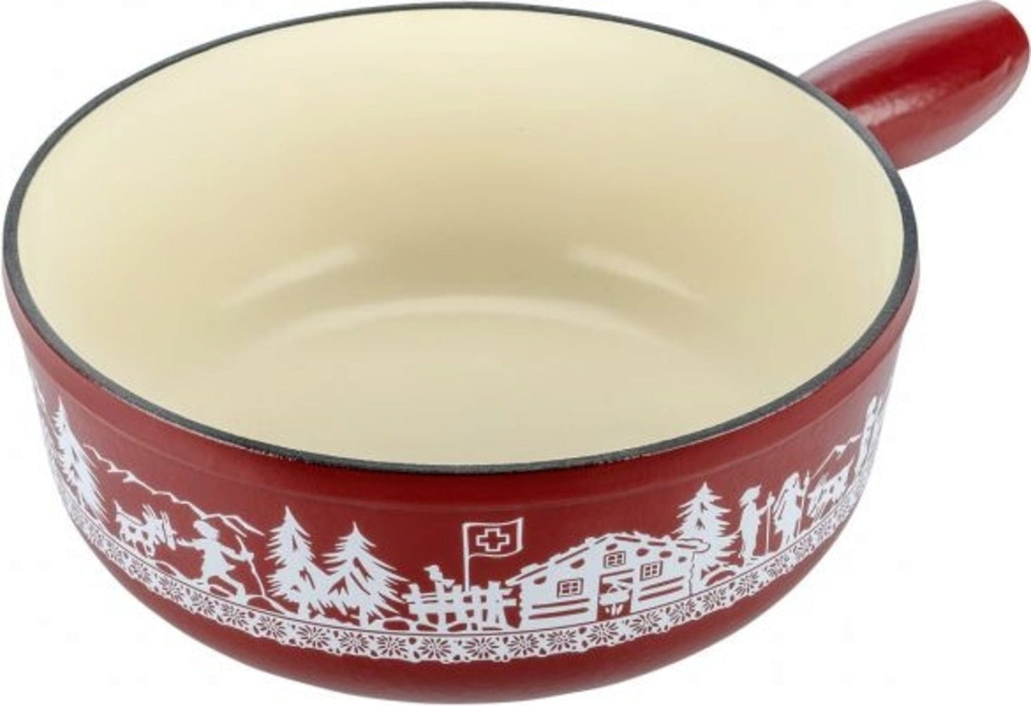 Caquelonen ‘Alpweide' av gjutjärn med en karakteristisk röd glasyr och vit siluetttryck övertygar både med sin enastående design och sin optimala värmeledningsförmåga och värmelagring.
