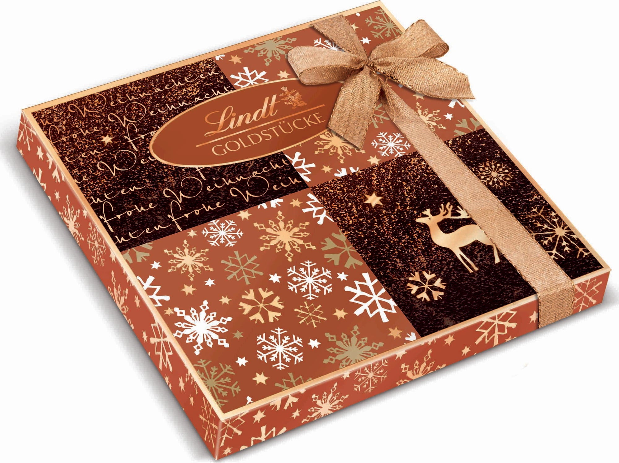 Ett bländande utseende till jul! Lindt Rosé Goldstück-pralinerna i vinterlig design är ett fantastiskt blickfång och förför med ett unikt urval av små, fyllda chokladbitar. En del av chokladen innehåller alkohol.