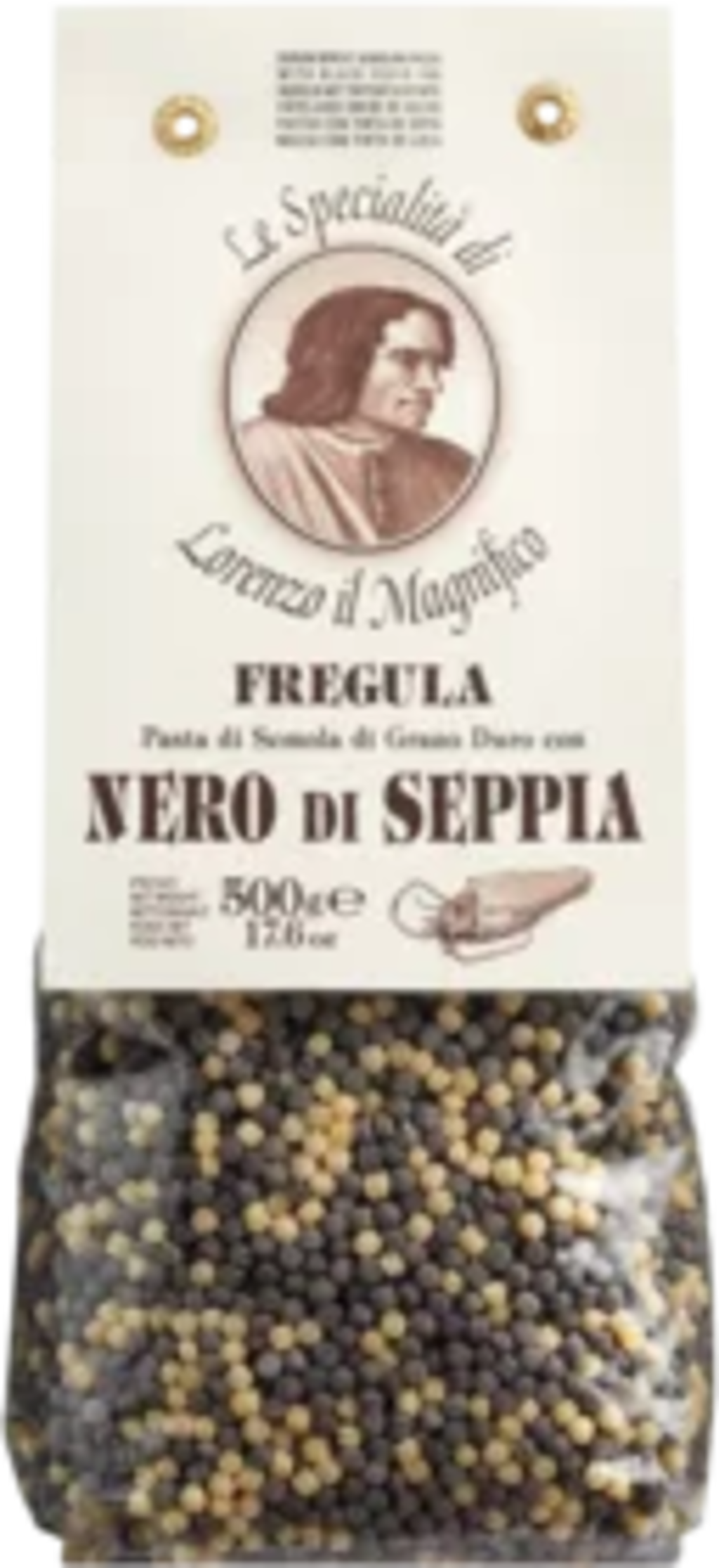 Upptäck Fregola Nero di Sepia, en visuellt och gastronomiskt fascinerande pastaspecialitet. Dessa små, runda pastabollar, gjorda av högkvalitativt durumvetemjöl, produceras med traditionella metoder, där några av bollarna är färgade djupt svarta med 2 % bläckfiskbläck.