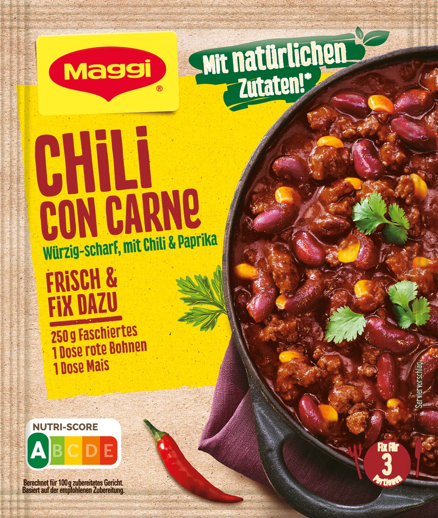 Med Maggi Chili con Carne lagar du enkelt en smakrik rätt med lagom hetta, utan krångel. Kryddmixen innehåller naturliga ingredienser som chili och paprika och ger en balanserad, pikant smak. Perfekt när du vill ha något gott men har ont om tid. Ett pålitligt recept som ger god smak och matglädje varje gång.