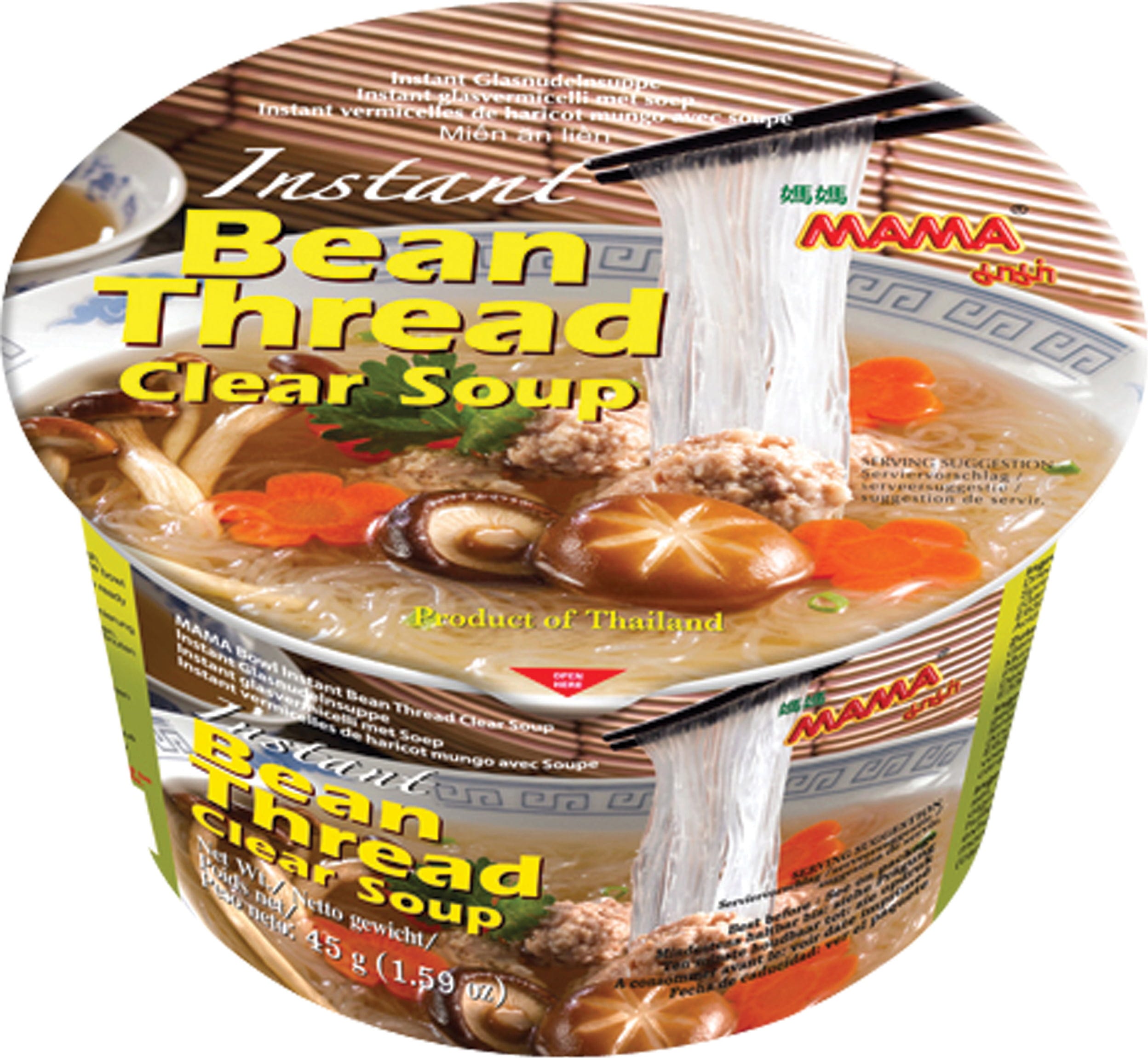 Denna snabblagade soppa från varumärket MAMA ger dig mjuka glasnudlar i en klar, milt smaksatt buljong. De blandade grönsaksflingorna kompletterar den lätta konsistensen och ger en frisk smak utan någon ansträngning från din sida.