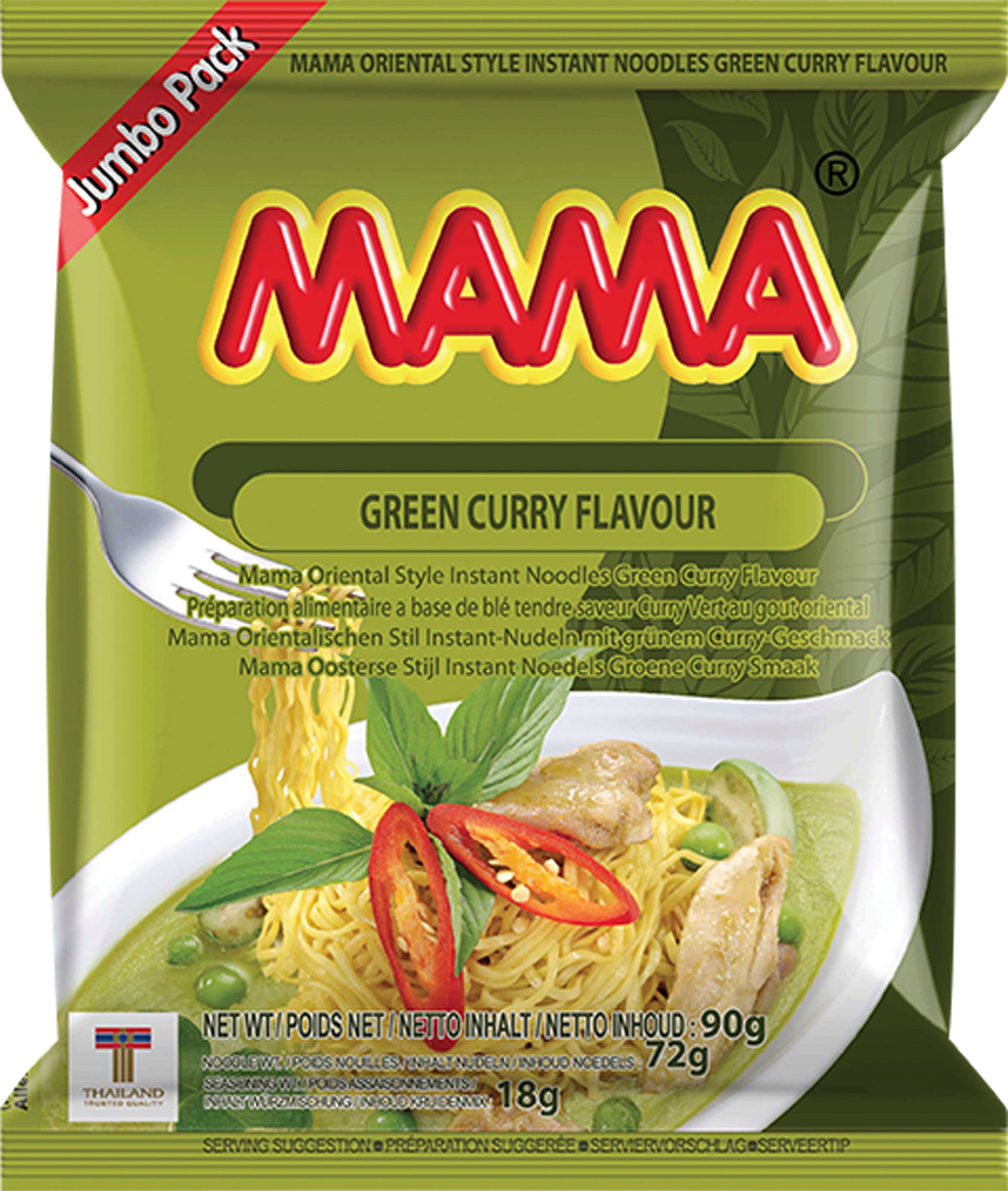 Snabbnudlarna från varumärket MAMA i varianten "Green Curry" njuter av en stark, krämig och kryddig currysås, fint balanserad med aromatiska kryddor. Tillagad på bara några minuter har du en smakrik maträtt med en asiatisk touch. Tillsätt bara varmt vatten, låt dra en kort stund och njut.