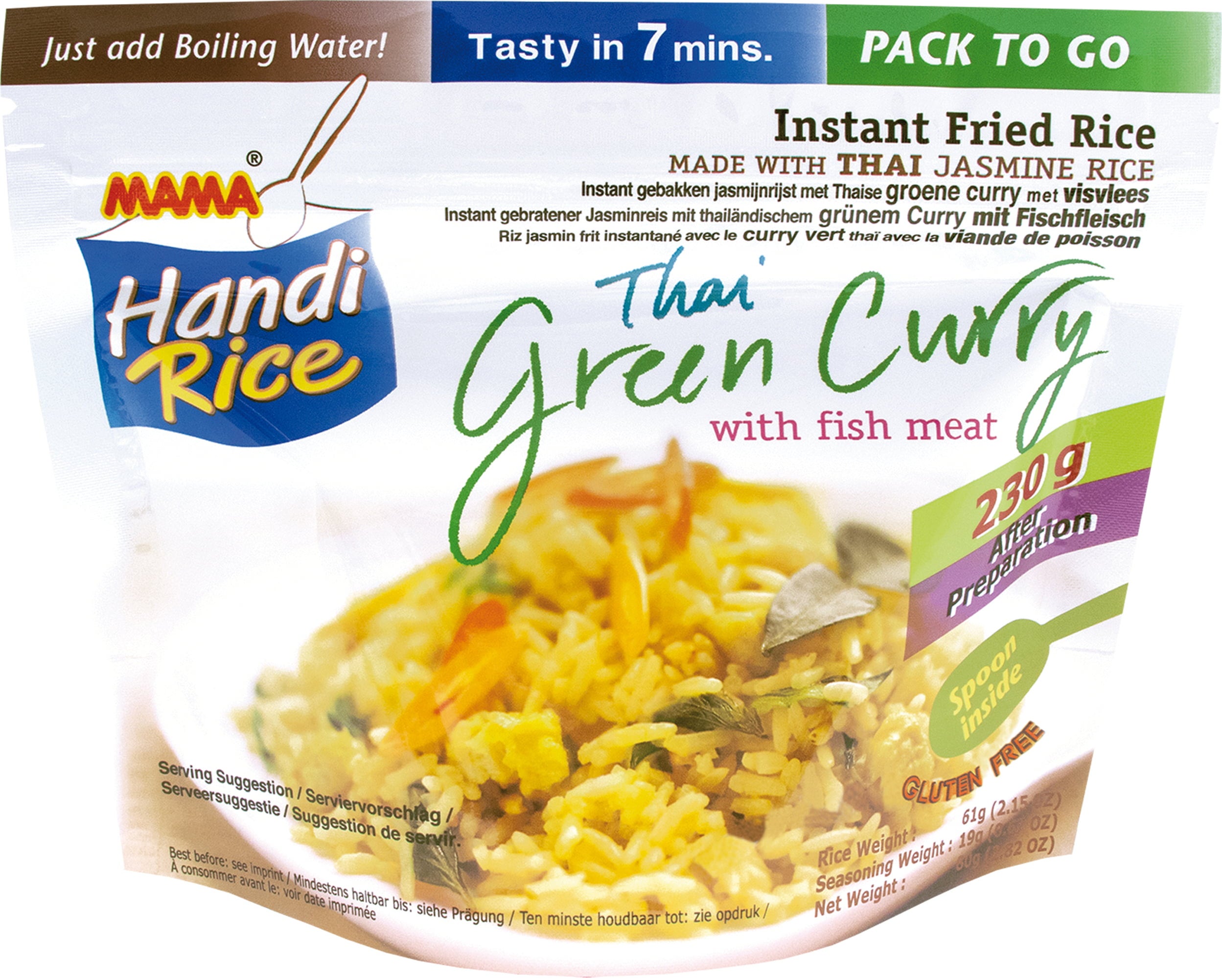 Detta snabbris från varumärket MAMA imponerar med sitt aromatiska jasminris och en starkt kryddad grön thailändsk currybuljong med en subtil hint av fisksmak. Tillagad på bara några minuter får du en smakrik asiatisk måltid med en autentisk profil.
