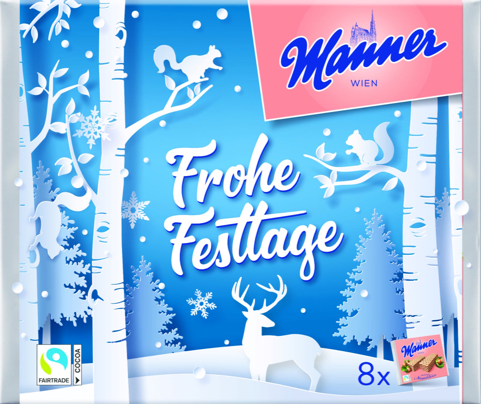 Den perfekta presenten till alla Manner-fans - de krispiga skivorna, fyllda med Neopolitaner-kräm, i en stor förpackning med julaktig design. Innehåller 8 förpackningar skivor som vardera väger 75 gram. Receptet är äggfritt.