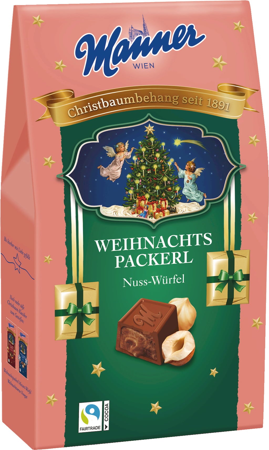 Alla älskar att packa upp de små festliga julpaketen från Manner: Delikat mjölkchoklad omsluter den finaste hasselnötskräm och krispiga små hasselnötsbitar - helt enkelt att smälta! Och även visuellt är de en fröjd: häng de små paketen i julgranen med den praktiska fästöglan eller använd dem som bordsdekorationer på festbordet.