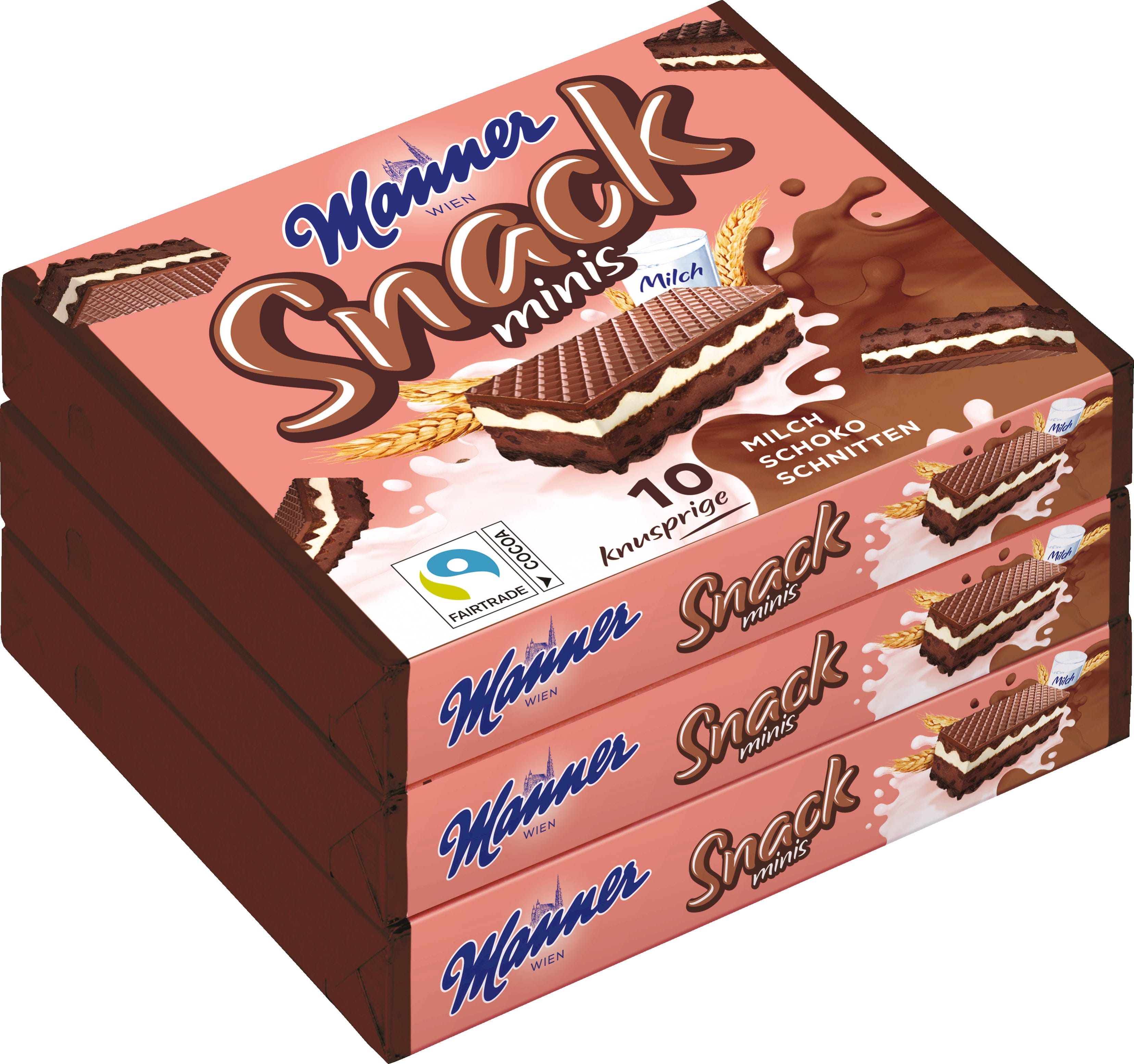 Tre gånger ren och skär knäckig lycka! Manner Snack Minis inspirerar tack vare en delikat våffla med stark kakaosmak och en fluffig, luftig fyllning i två versioner: mjölk- och kakaokräm med knapriga kexbitar ger en mjuk, söt behandling för gommen, medan den mörka basvåfflan glänser i en chokladglasyr och fulländar detta oemotståndliga mellanmål.