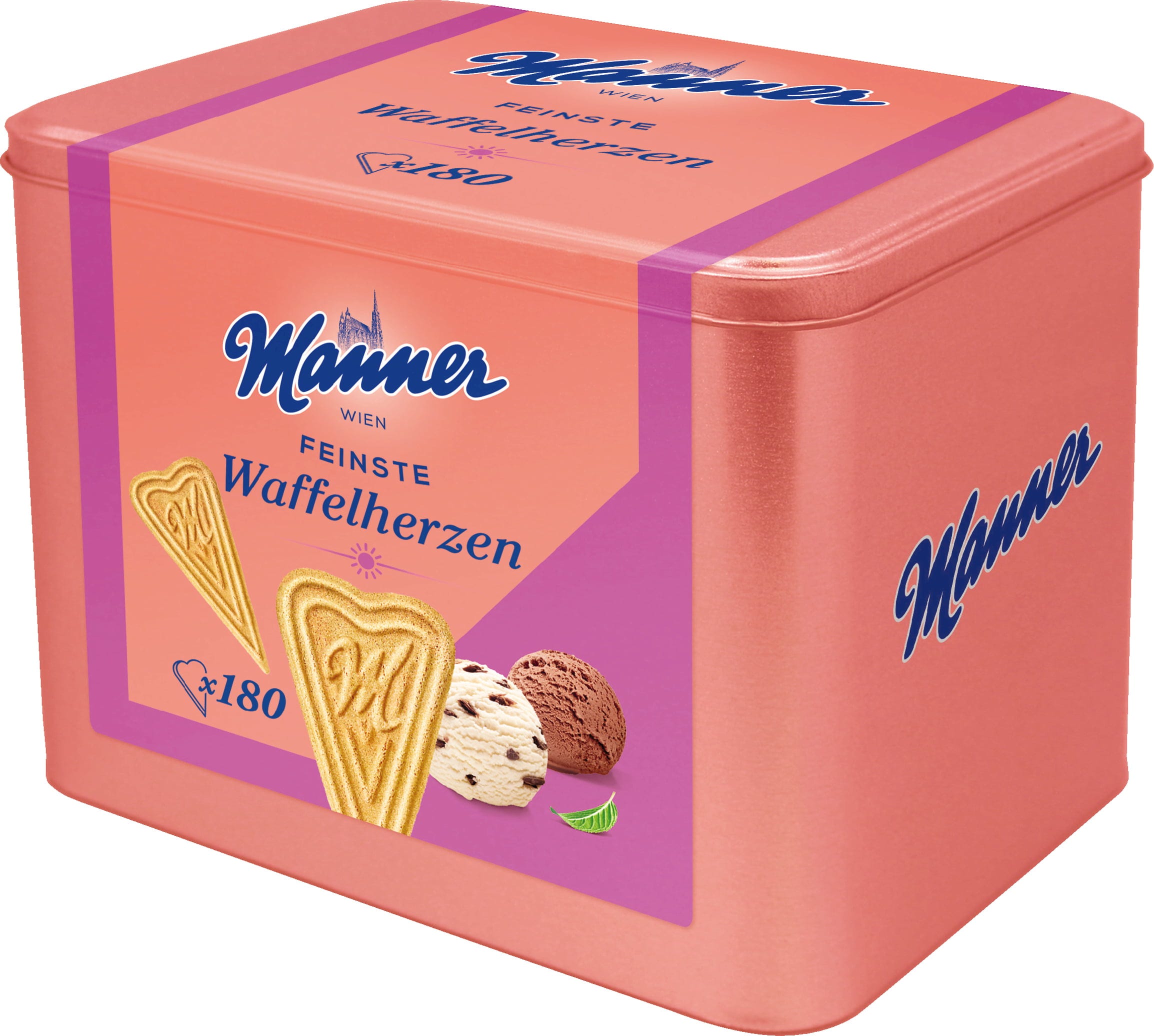 Oavsett om det är till en sommarfest, ett barnkalas eller helt enkelt för att du älskar de extra krispiga våffelhjärtan lika mycket som vi: Med Manner för våffelhjärtan är du säker på att de klassiska glassdekorationerna inte tar slut för snabbt. Den innehåller trots allt hela 180 stycken av den läckra glassknäckiga dekorationen. Den återförslutningsbara metallburken ser snygg ut och håller våffelhjärtan fräscha och krispiga under lång tid.