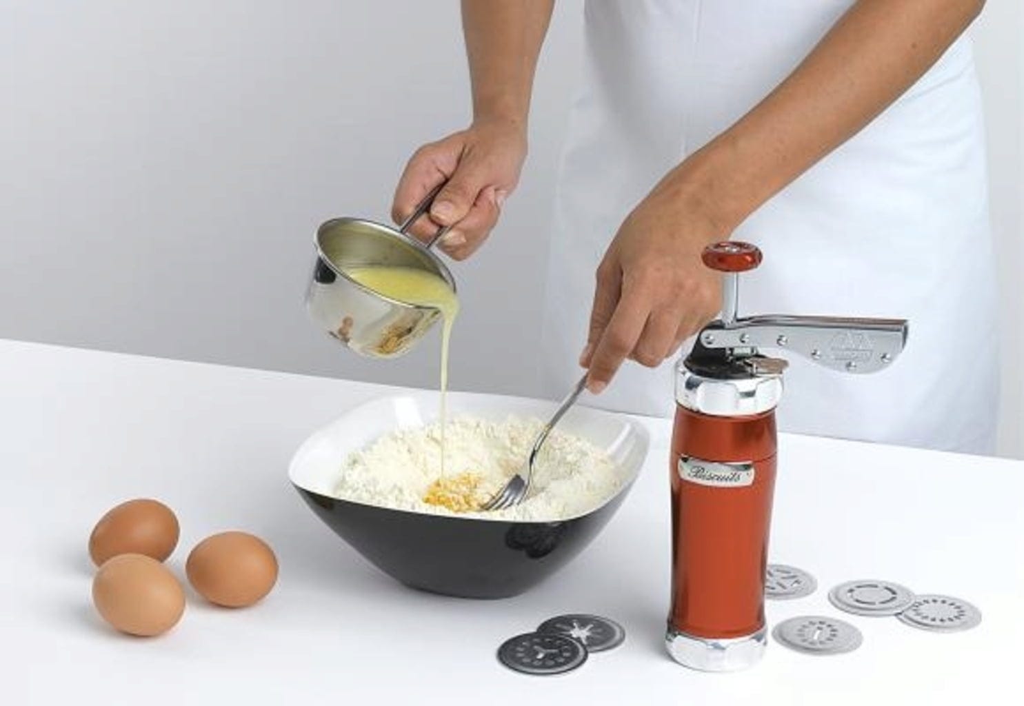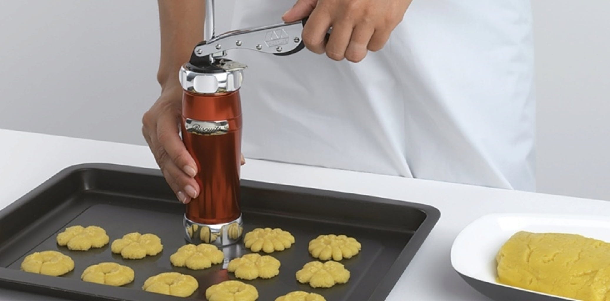 Med kexpressen kan man göra kex i 20 olika former. Häll bara degen i pressen och sätt in önskad form. Med en fyllning kan man göra cirka 20-25 stora eller 35-40 små kakor. En annan fördel är att du inte behöver smörja plåten eller klä den med bakplåtspapper.
