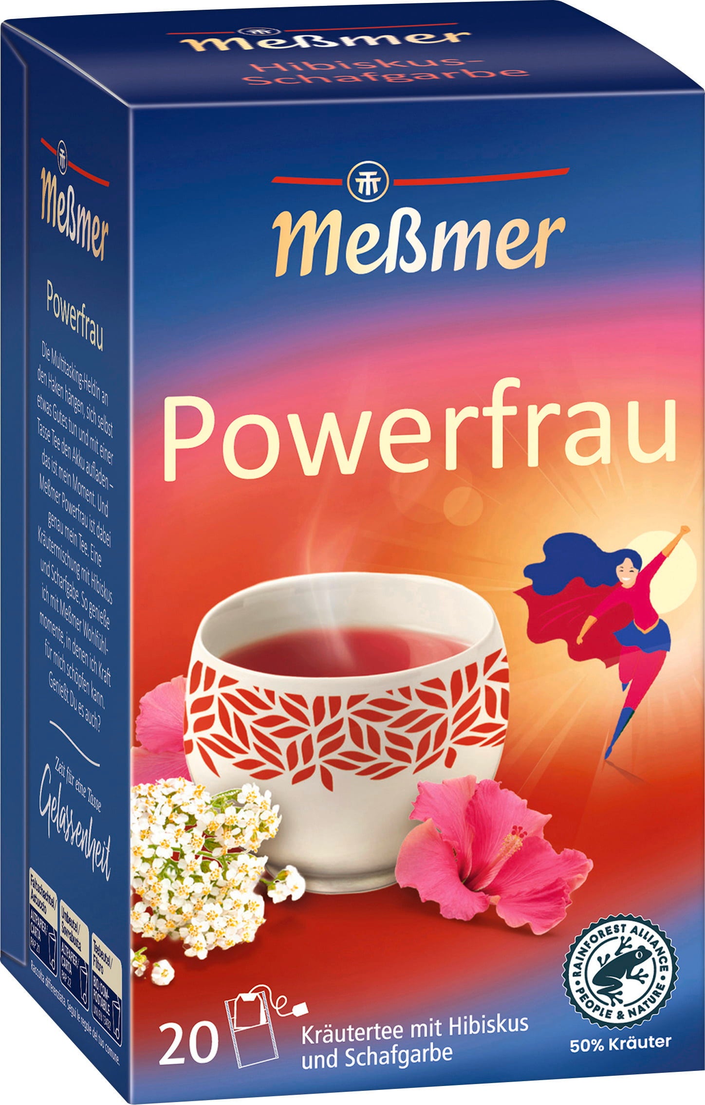 Örtteet Powerfrau från Meßmer kombinerar bland annat hibiskus, rölleka, pepparmynta, daggkåpa och hallonblad. Perfekt för vardagens hjältinnor – till dig själv eller som en omtänksam gåva.