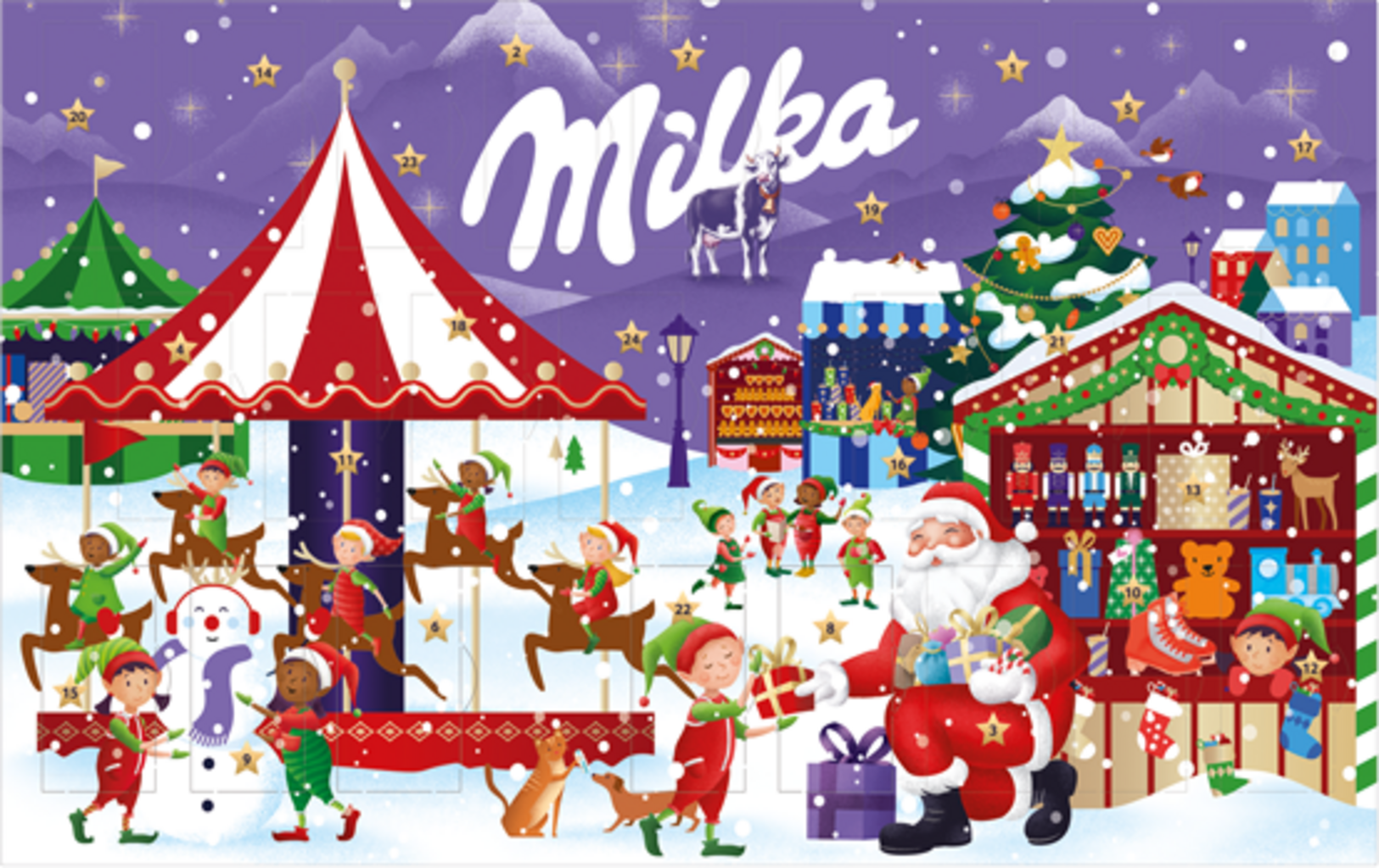 Milka-snögubben besöker också en julmarknad med sina vänner! Den vackra vinterscenen döljer 24 Milka-klassiker: Naps! De små bitarna av alpin mjölkchoklad väcker nostalgiska minnen och skapar njutning med den typiska Milka-smaken.