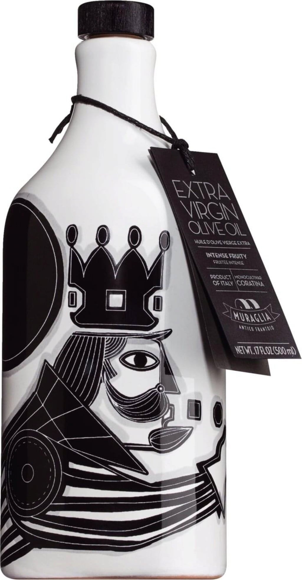 Fruktigt intensiv olivolja av apuliska Coratina-oliver. Muraglia skördar sina oliver för hand, kallpressar dem varsamt i stenpress och fyller dem i handdrejade lerkrukor. Det kungliga motivet på flaskan är skapat av den unga designern Pierpaolo Gaballo.