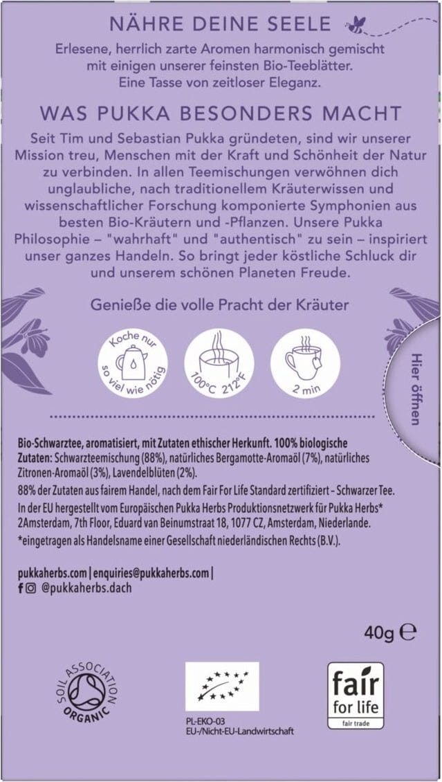 | Ansvarigt livsmedelsföretag: | Lipton Teas and Infusions Germany GmbH, Axel-Springer-Platz 3, c/o WeWork, 20355, Hamburg, Tyskland, kontakt@pukkaherbs.de |