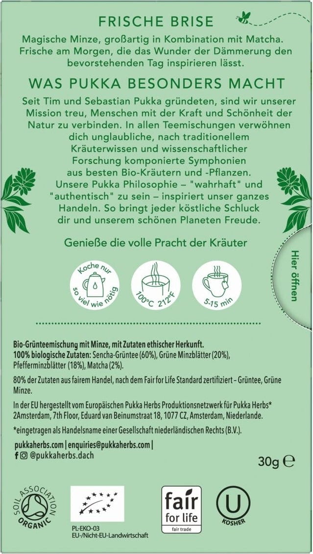 Detta unika gröna te har skapats av PUKKA:s örtexperter och nutritionister, som kombinerar de senaste vetenskapliga rönen med traditionell örtkunskap. Resultatet är en synergistisk kombination av ekologisk mynta, pepparmynta, grönt sencha-te och matcha, vilket skapar en balanserad kopp med svalkande smaker och subtila, fylliga toner. För en utsökt kopp full av vitaliserande smaksensationer.