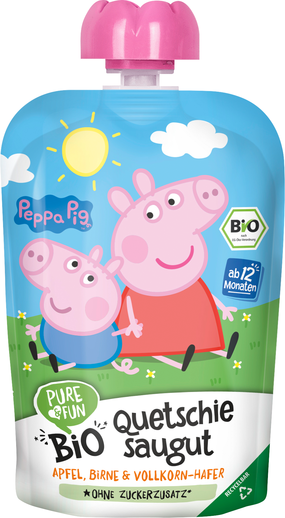 Frukt hör hemma i varje äventyrsutrustning! Peppa Pig ekologiska klämmisar med äpple, päron och näringsrik fullkornshavre är det perfekta mellanmålet – hemma eller på språng. En härligt fruktig dryckesupplevelse för både små och stora barn – 100 % ekologisk och helt utan tillsatt socker.