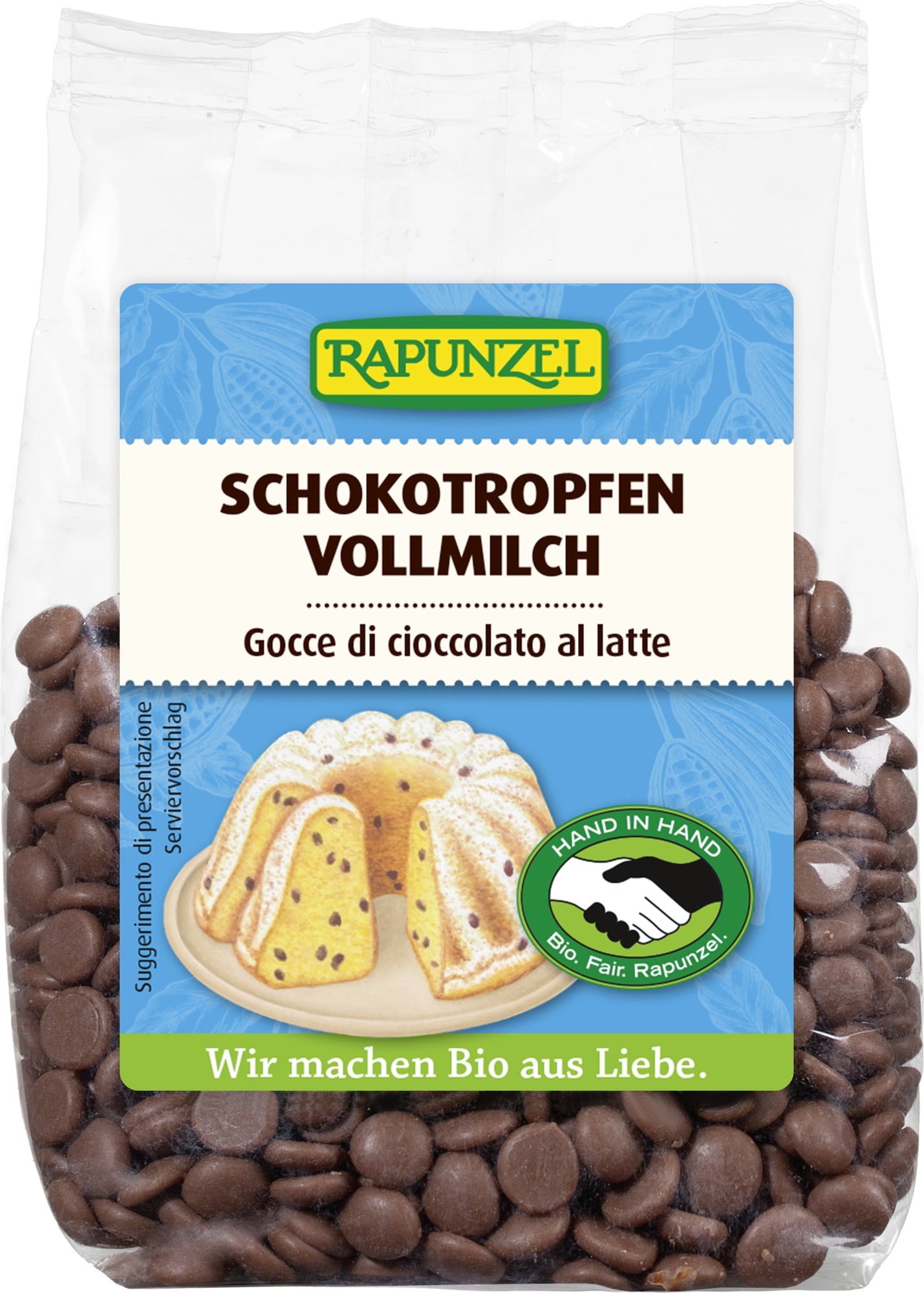 Rapunzels ekologiska mjölkchokladknappar med bourbonvanilj och minst 37 procent kakaohalt är formstabila och passar perfekt som chokladingrediens i muffins, kakor, småkakor och mycket mer.