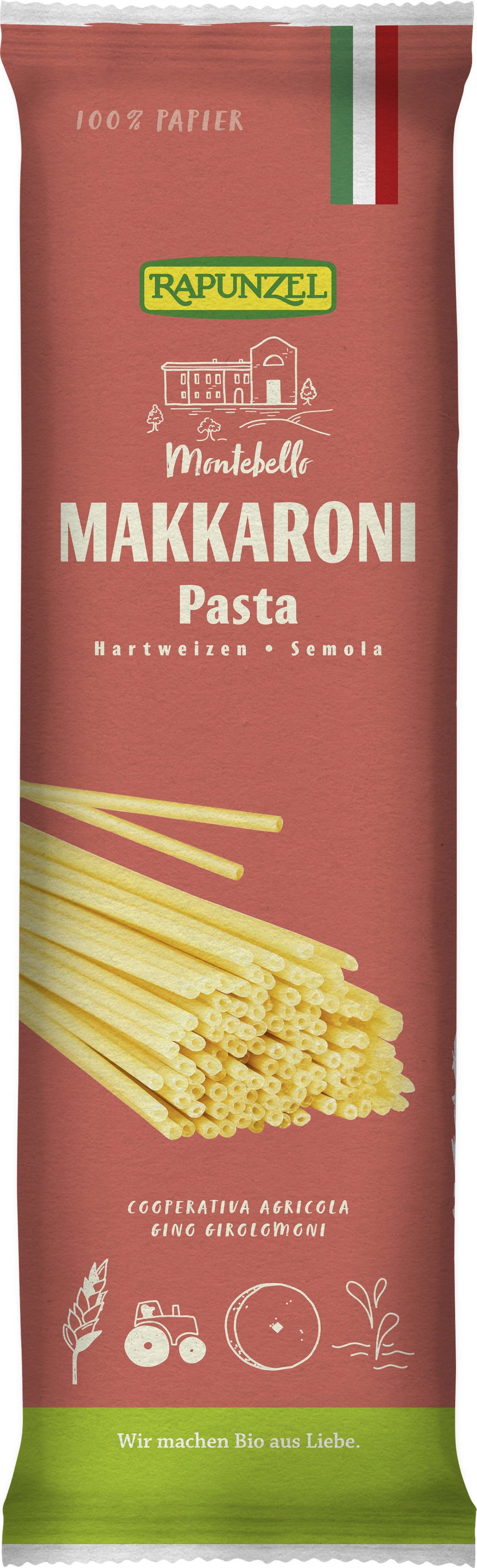 Makaroni är ihåliga, lite tjockare nudlar i spaghettilängd, och en älskad klassiker världen över. De passar utmärkt till krämiga såser, som tillbehör eller i gratänger. Rapunzel tillverkar sin pasta hos ett erfaret italienskt pastahantverk: bara rent durumgryn, friskt källvatten och långsam torkning vid låg temperatur bevarar både näringsämnen och smak. Äkta italiensk mathantverk i ekologisk toppklass. Självklart även för veganska recept!