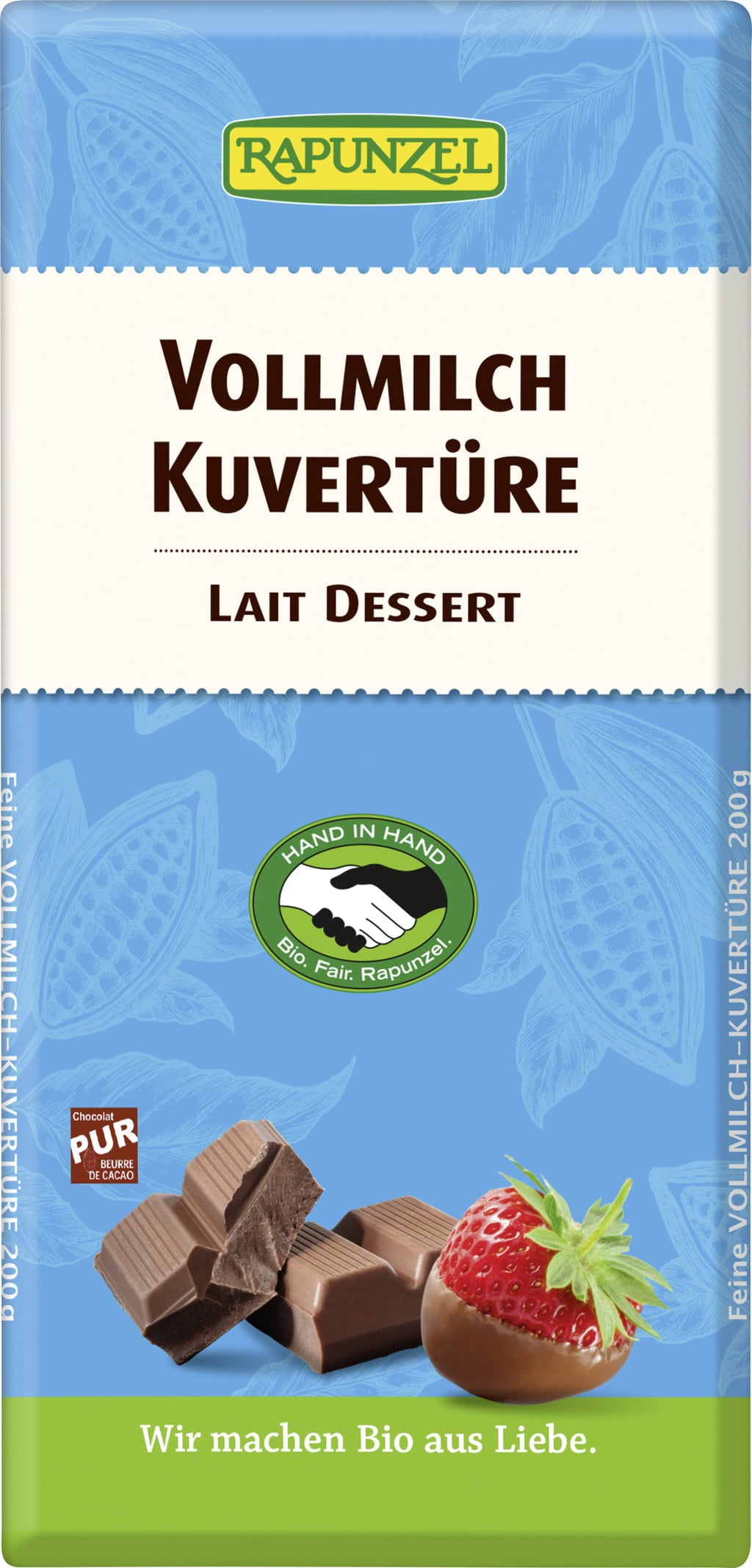 Ge praliner, desserter, tårtor och mycket mer en fin finish med Rapunzels ekologiska mjölkchokladkuvertur. Med minst 37 procent kakaohalt och en rund vaniljton passar den perfekt för både glasyr och bakning.