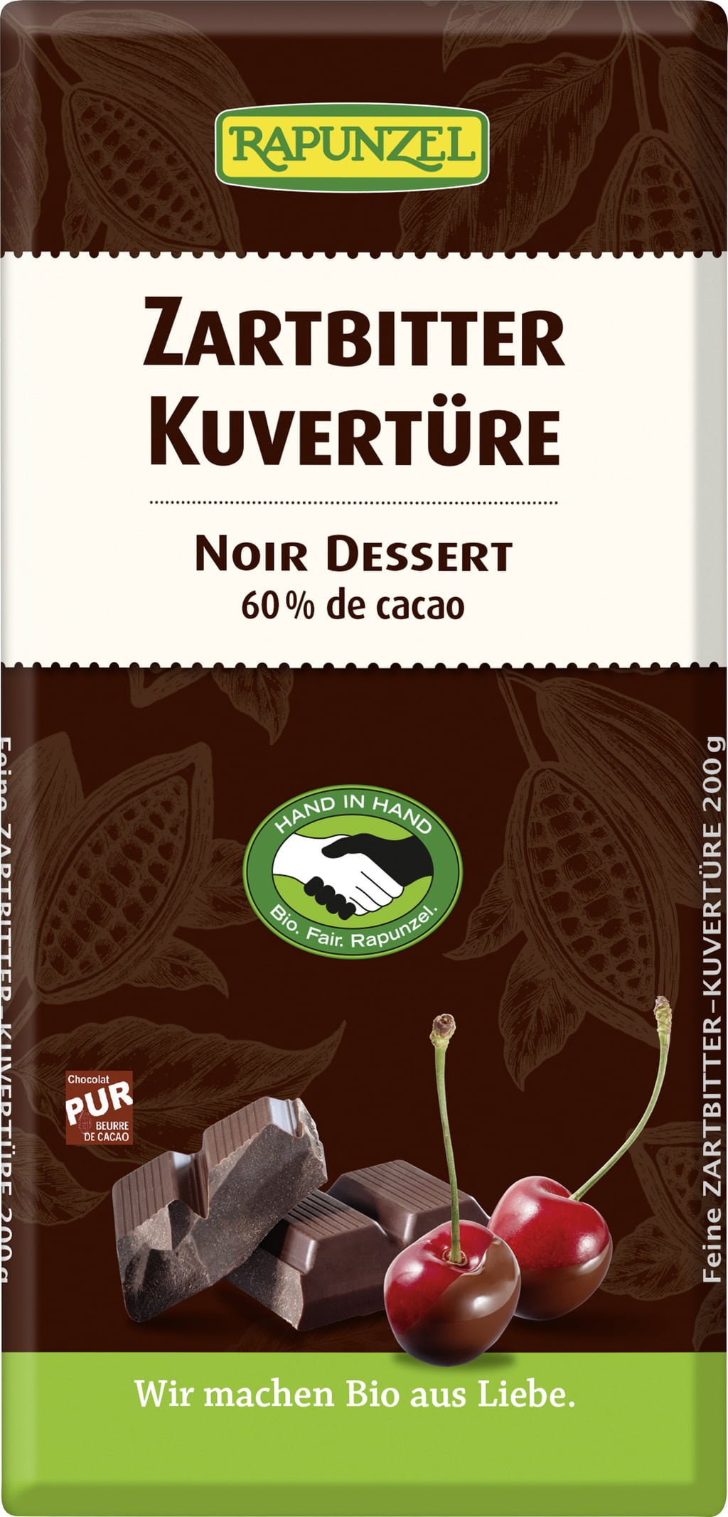 Praliner, frukt eller tårtor: de blir extra goda med ett lager choklad. Rapunzels mörka kuvertur är tillverkad av rättvisemärkt kakao och socker och innehåller minst 60 procent kakao. Den passar perfekt till både bakning och glasering. Ett mjukt inslag av vanilj ger chokladen en extra nyans av smak.