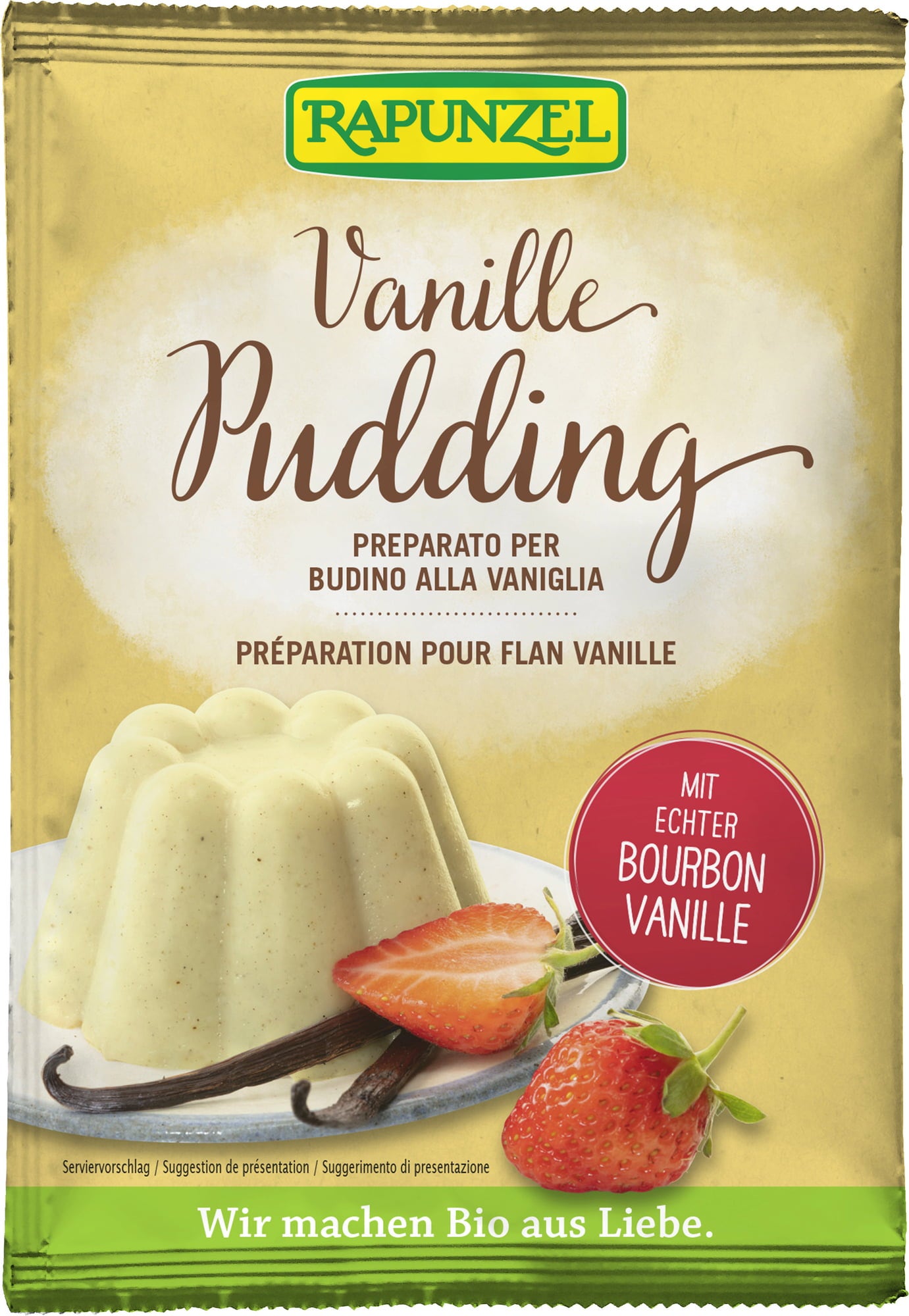 Tillagning: Blanda puddingpulvret med 6 msk kall mjölk eller växtdryck och 40 g Rapunzel Cristallino-rörsocker eller Rapadura-rörsocker. Koka upp 500 ml mjölk eller växtdryck, ta från värmen och vispa ner blandningen. Koka upp en kort stund igen och häll i en sköljd form. Låt stelna i kylskåp i minst 4 timmar.