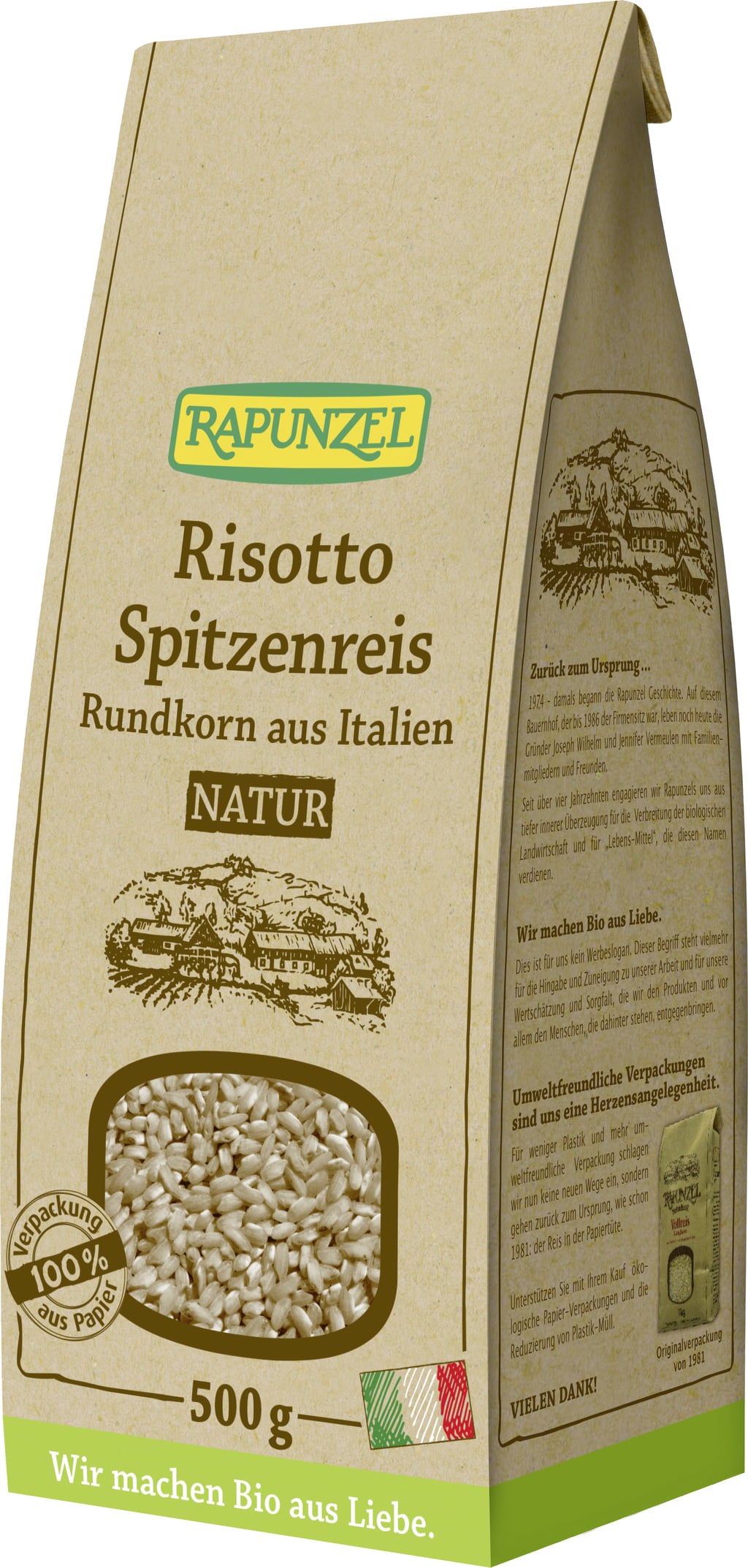 "Ribe" är en mild och aromatisk specialsort bland risottoriser och finns här som fullkornsvariant. Odlas i Piemonte, bevattnas med friskt bergsvatten och skördas med lång erfarenhet från ekologiska odlare. Resultatet är ett ris i toppklass som kokar krämigt och är perfekt till risotto. Det passar också till paella, soppor, sallader eller som fyllning. Den milda nötigheten är en riktig smakförhöjare.
