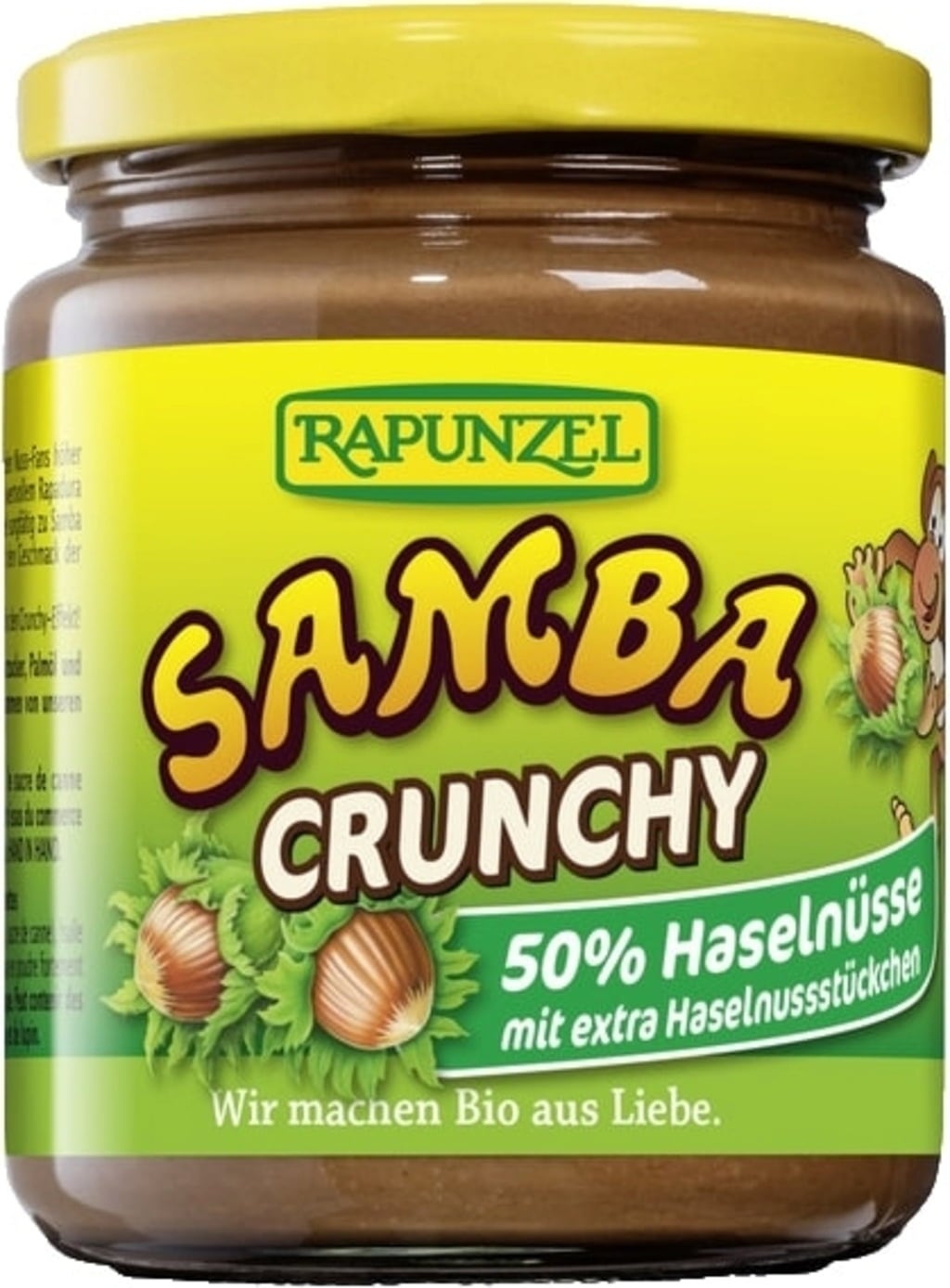 Sötsugna nötälskare älskar Samba Crunchy. Här samsas knapriga hasselnötsbitar med Rapadura-rörsocker, känt för sin karamelliga smak, Cristallino-rörsocker, aromatiskt kakaopulver och krämigt palmolja till en oemotståndlig påläggsupplevelse. Perfekt som fyllning, till smörgås eller bara som den är. En riktig humörhöjare som ger ny energi.