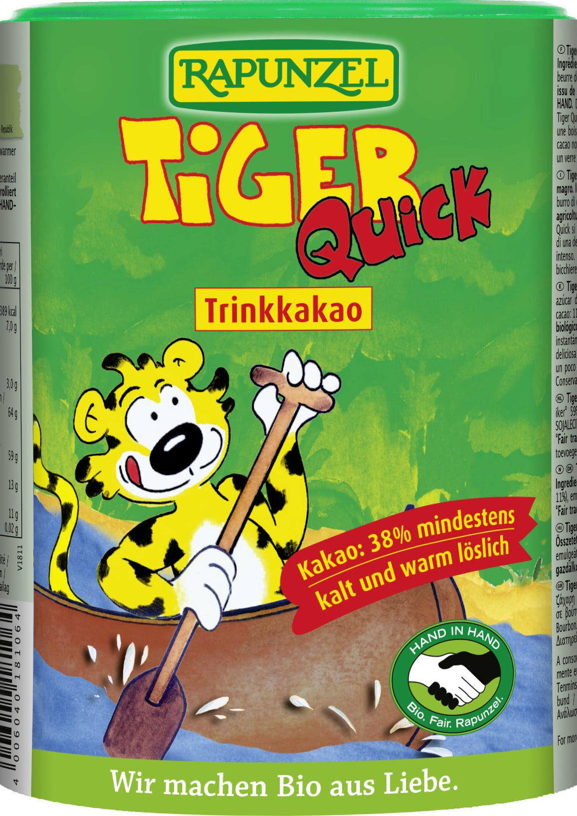 Tiger Quick instantkakao från Rapunzel kan blandas med både varm och kall mjölk. Med 38 procent kakaohalt smakar den härligt chokladigt. Den är dessutom förfinad med äkta bourbonvanilj.