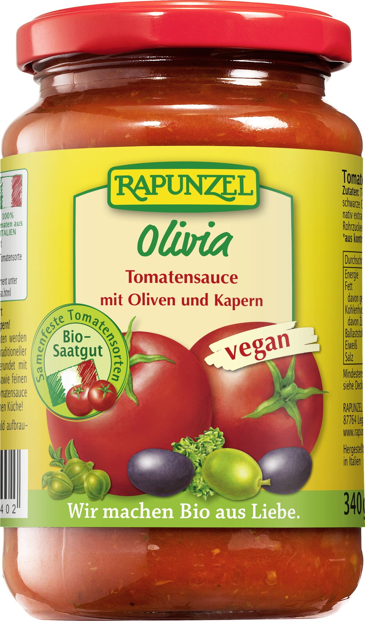Tomatsåsen är en riktig klassiker i det medelhavsinspirerade köket! Olivia-såsen från Rapunzel är smaksatt med oliver, kapris, örter och kryddor och passar perfekt till alla pastarätter, men även till soppor och grönsaksrätter.