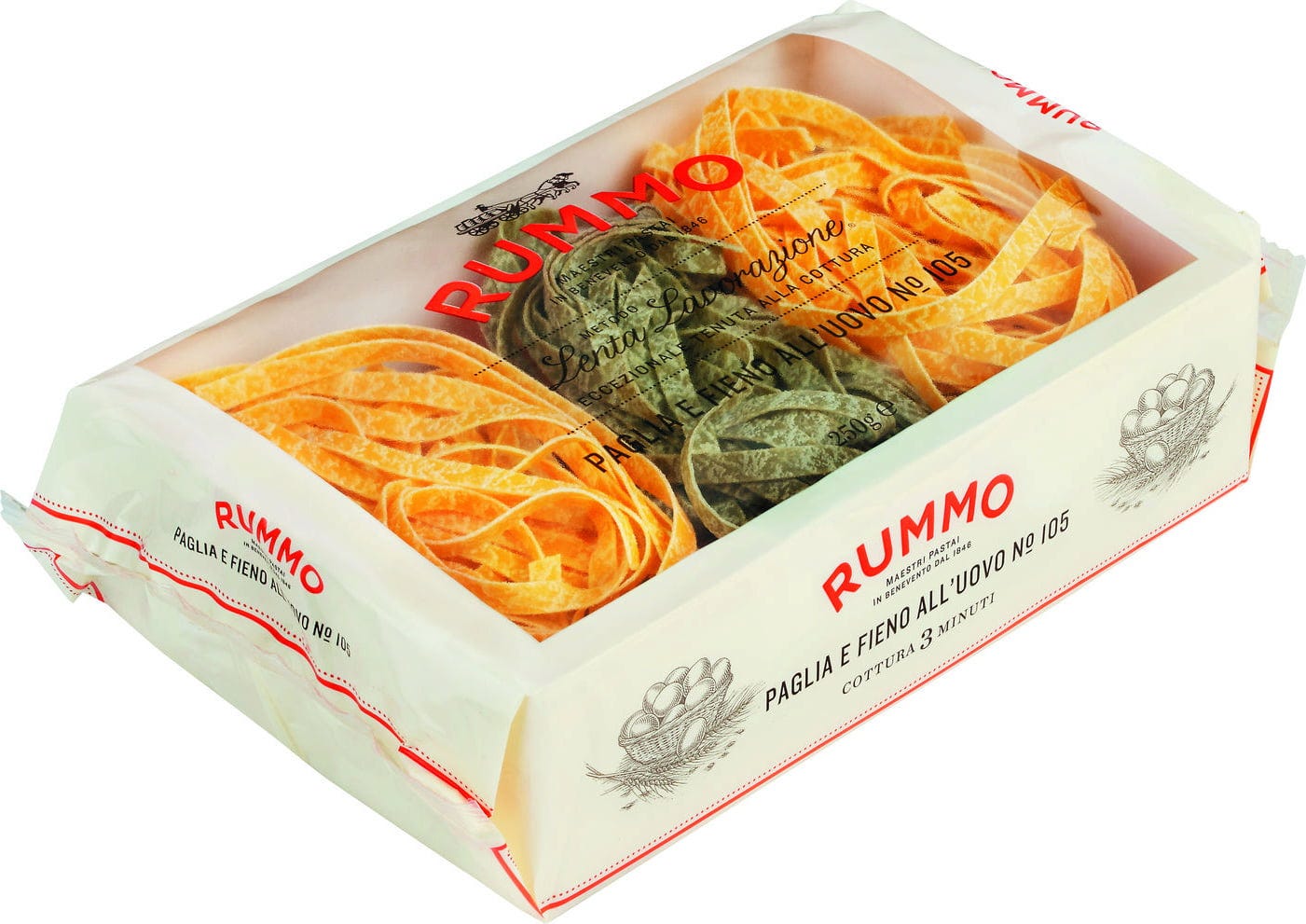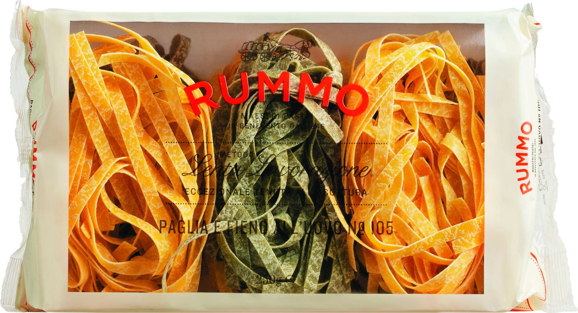 Med den klassiska ”paglia e fieno”-blandningen från Rummo får du både variation och färg på tallriken. Kombinationen av ljus äggpasta och grön pasta med spenat skapar en fin kontrast.