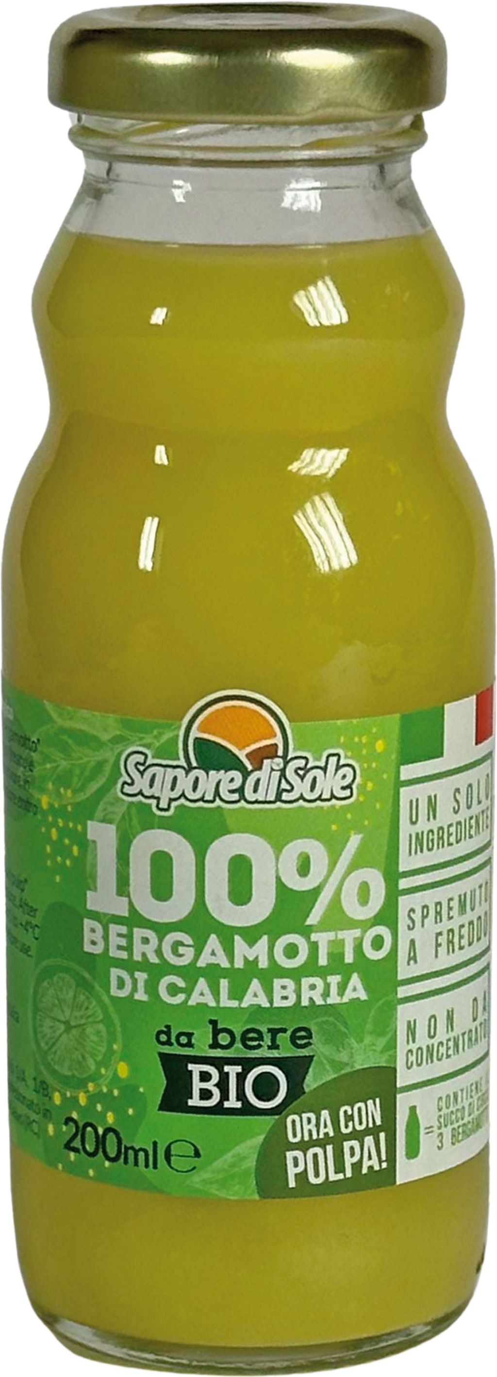 Den högkvalitativa ekologiska juicen gjord av kalabriska bergamotter kommer från första pressningen och ger en uppfriskande paus. Den innehåller också fruktköttet och kan avnjutas ren eller utspädd med andra juicer. För övrigt är äppeljuice särskilt lämplig för detta.