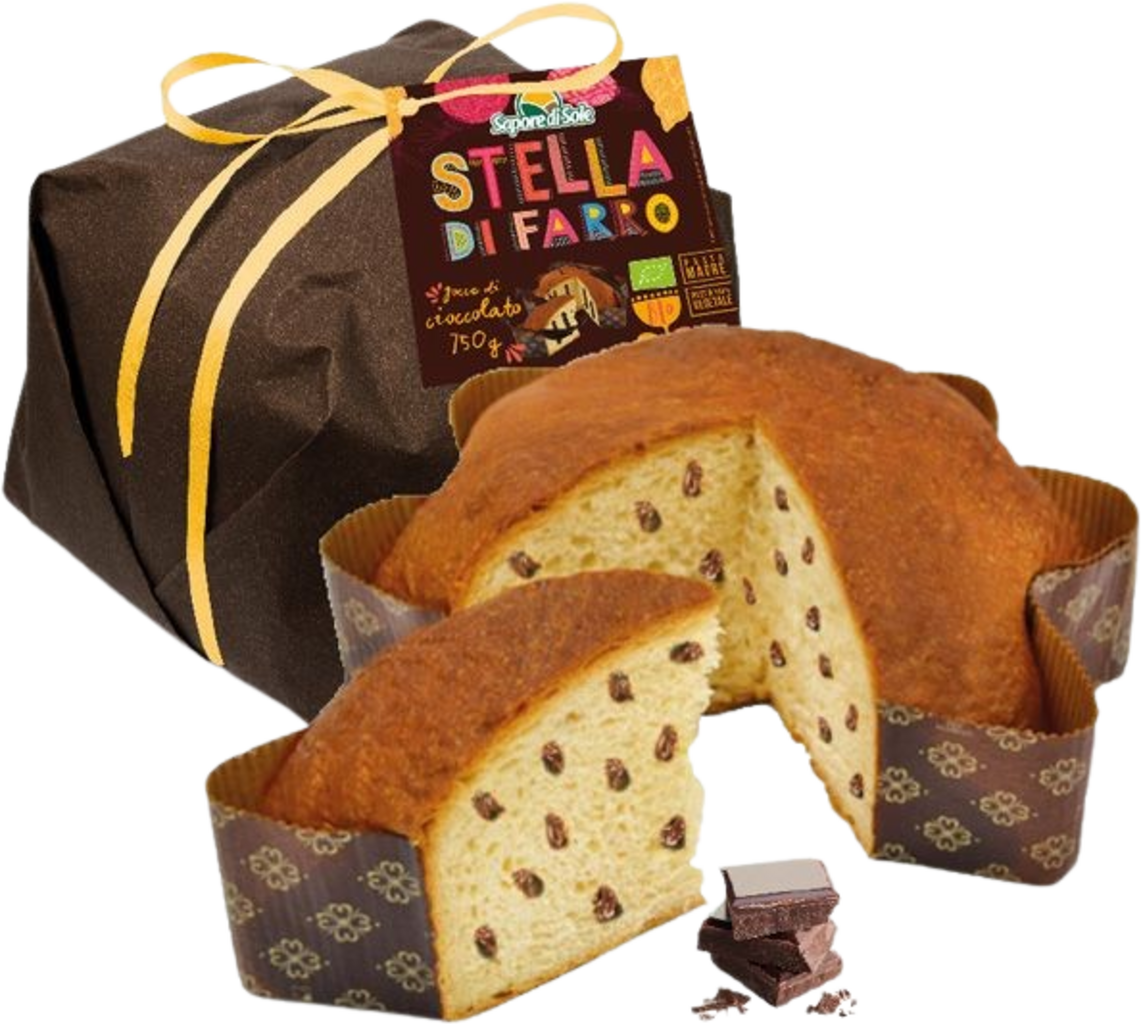 Stella di farro Gocce di Cioccolato från Sapore di Sole är en läcker julpanettone gjord på surdeg med ett rent växtbaserat recept. Inuti degen finns smältande chokladbitar som gör denna julklassiker till en oemotståndlig njutning. Panettone är det perfekta tillskottet på julbordet och är en favorit hos både stora och små.