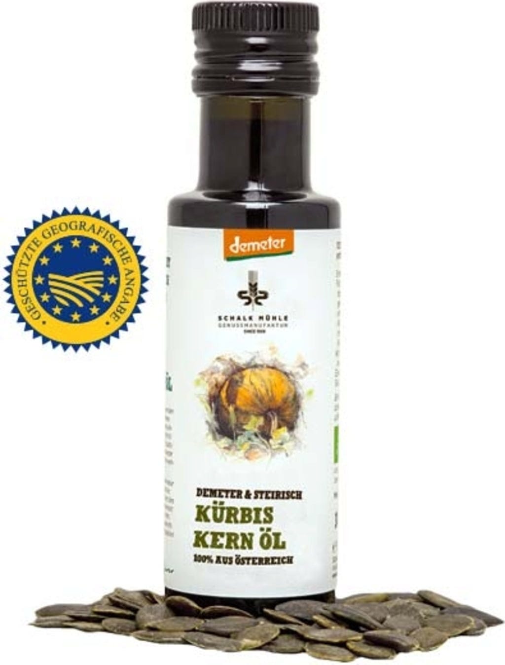 Oberoende kontrollinstanser garanterar ursprunget (ursprungsmärkning g.g.A.) av dessa pumpafrön. Finaste regionala pumpafrön mals skonsamt, med decenniers erfarenhet. Med handgjord vedeldning rostas de fina svarta fröna och ger den kallpressade oljan sin unika arom. Den mörkgrönsvarta färgen med den oförväxliga nötiga doften gör denna olja så unik. Pumpakärnoljan är också utmärkt för att förfina en klassisk steirisk äggrätt.