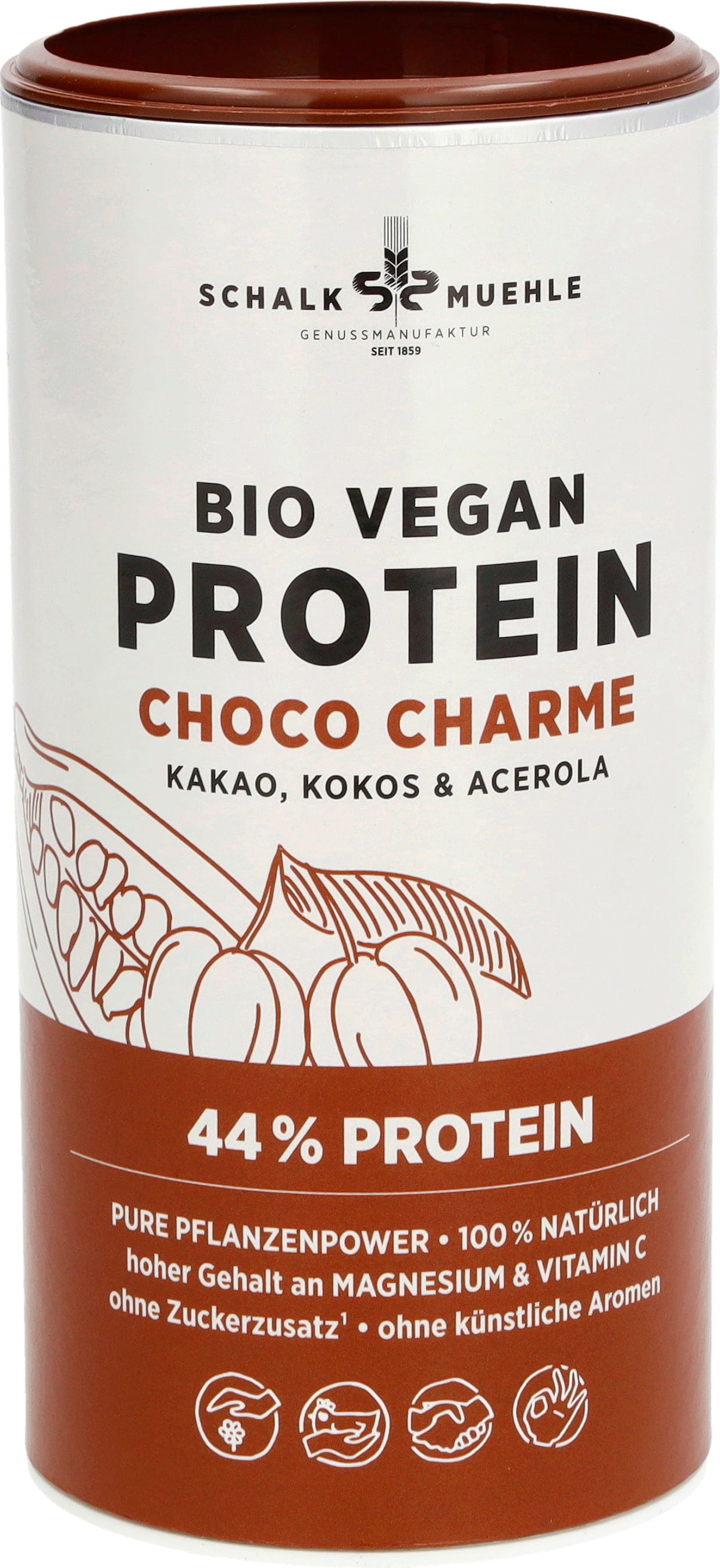 Det veganska ekologiska Choco Charme proteinpulvret från Schalk Mühle förenar en trio som verkligen imponerar! Kakao, kokos och acerola sveper här runt dig. Mixen ger dig vitamin C från acerola och ett högt innehåll av magnesium. Oavsett om det är som shake, i smoothie eller müsli – Choco Charme ger dig på många sätt växtbaserat protein i din kostplan.