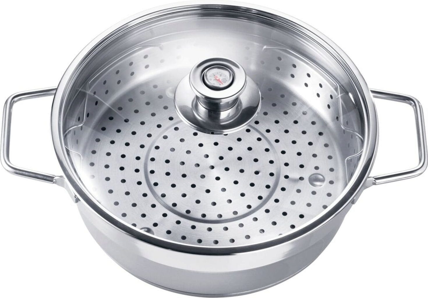 Multifunktionellt köksredskap som möjliggör särskilt skonsam och aromatisk tillagning. För att göra detta tillsätter du först vatten i grytan tillsammans med utvalda aromingredienser. När vattnet kokar placeras den färska maten på ångkokaren. På så sätt bevaras alla viktiga vitaminer och näringsämnen.