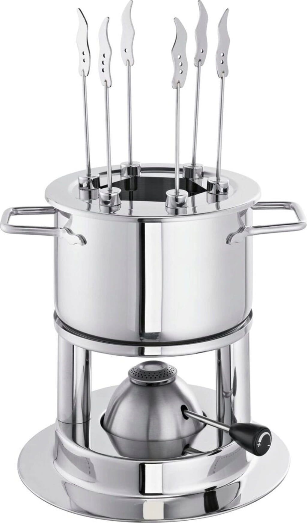 Så fort Flamenco Hot Fondue packas upp blir det riktigt varmt, eftersom grytan kan förvärmas på alla spishällar och även i ugnen. Den tål även maskindisk för problemfri rengöring. Den klassiska looken i rostfritt stål harmoniserar med alla bordsdekorationer. Designen på de sex gafflarna är baserad på formen av en låga.