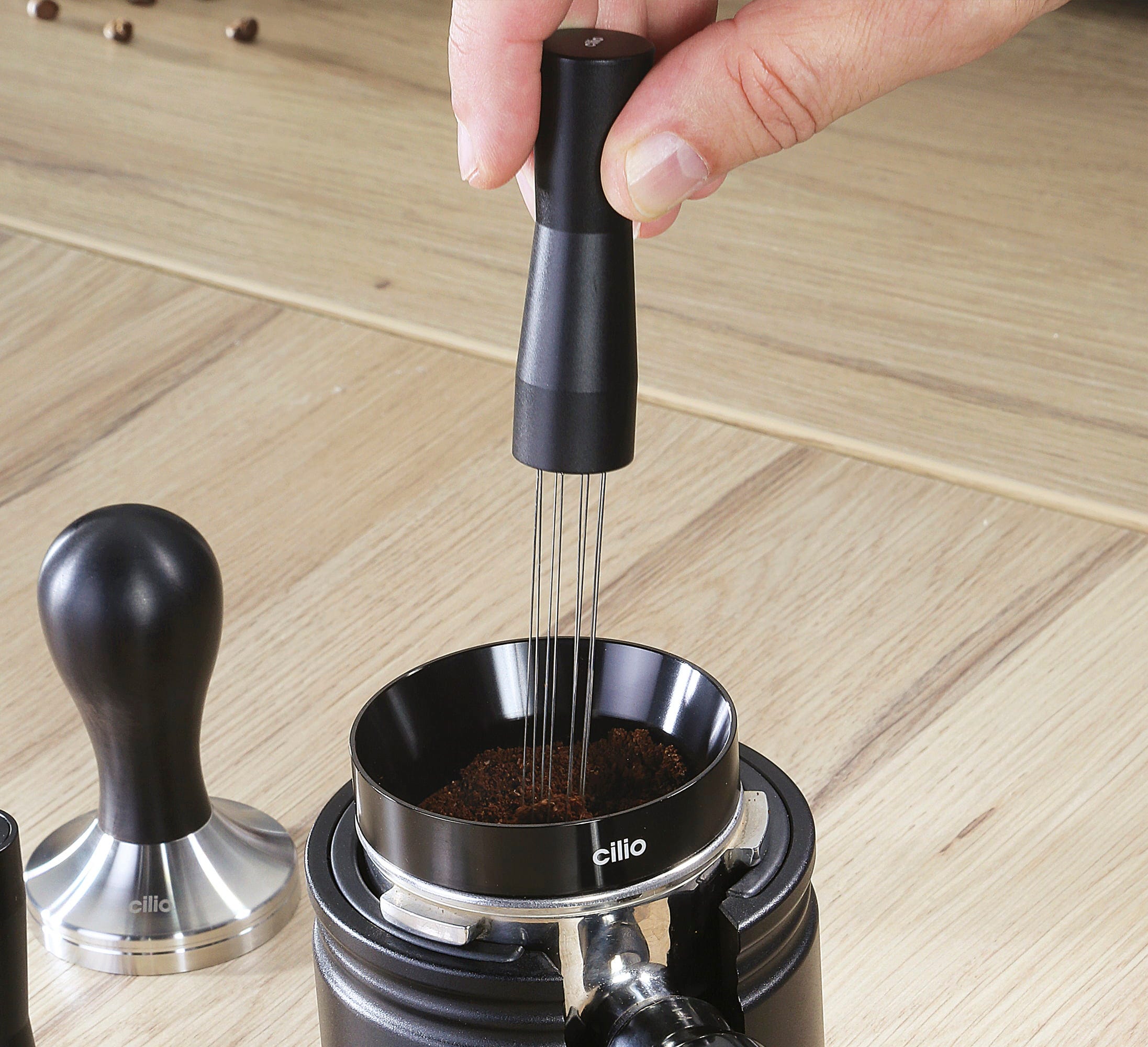 Säg farväl till klumpigt kaffepulver och "channeling"! Kaffienålen BARISTA från cilio är ett måste i varje seriöst espresso-setup. För in nålarna i kaffepulvret och rör i cirklar från botten till toppen. Resultatet blir en jämn fördelning i portafiltret och en bättre extraktion i varje kopp.