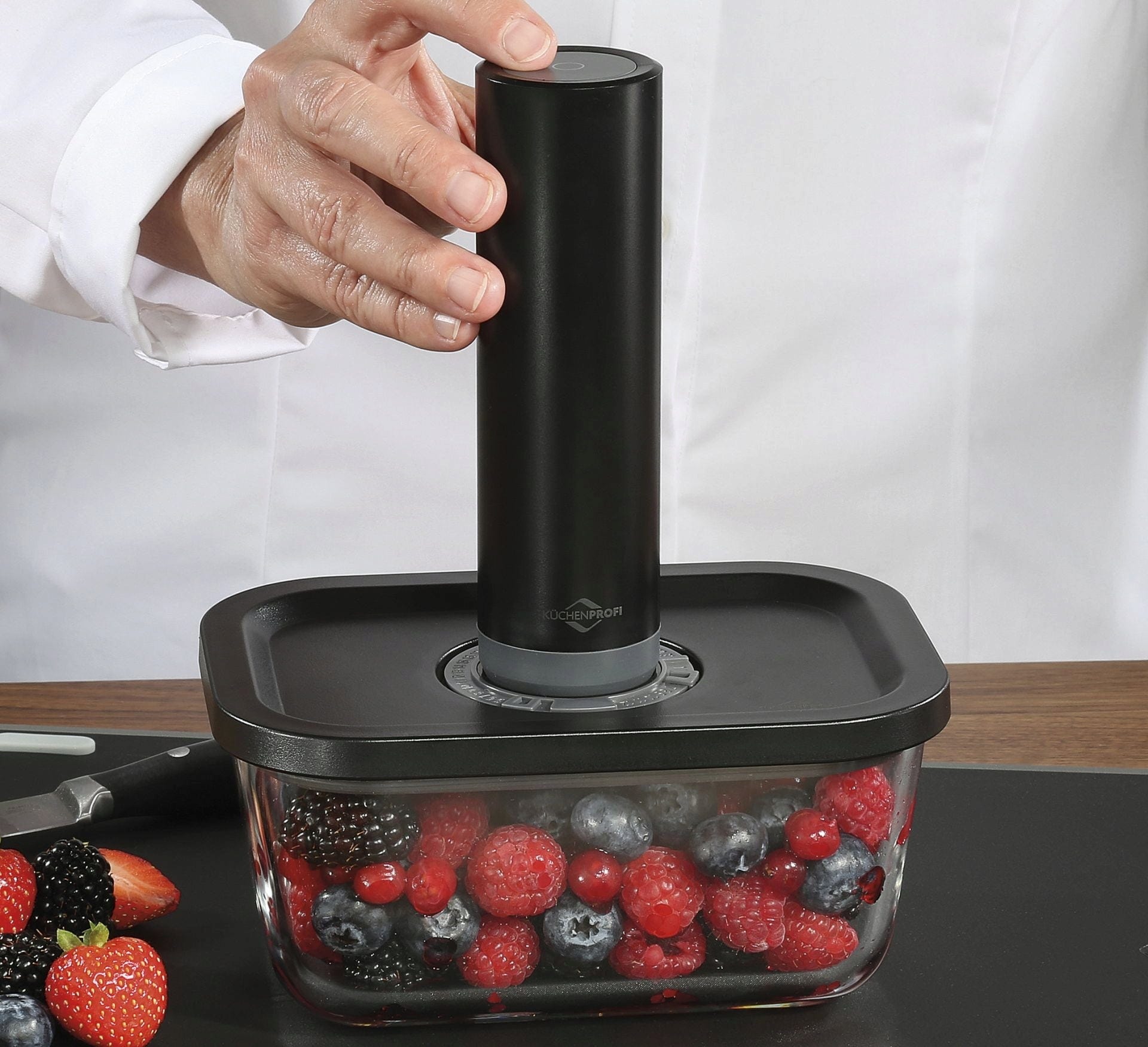 Så här gör du: Fyll glasburkar eller påsar med maten och ta bort luften med ett knapptryck tack vare den elektriska vakuumpumpen. Arom, smak och näringsämnen bevaras perfekt. Förvara i kylskåp eller frys - och värm direkt i ugnssäkra glasburkar.