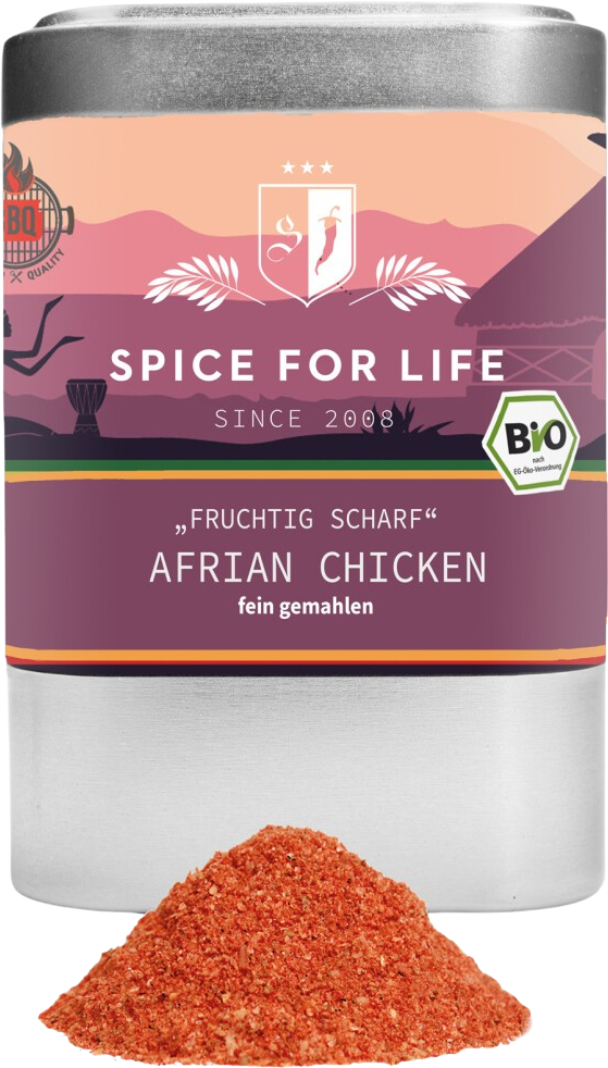 Fruktig mango, eldig cayennepeppar, söta kokosflingor - en spännande smakupplevelse som ger en helt ny sida till grillade, rostade och bakade fjäderfärätter! Använd kryddblandningen Spice for Live Organic African Chicken direkt för att krydda din kyckling eller för aromatiska marinader. Används den som en krydda för krispig panering, ger den en exotisk smakupplevelse till söndagens bakade kyckling!