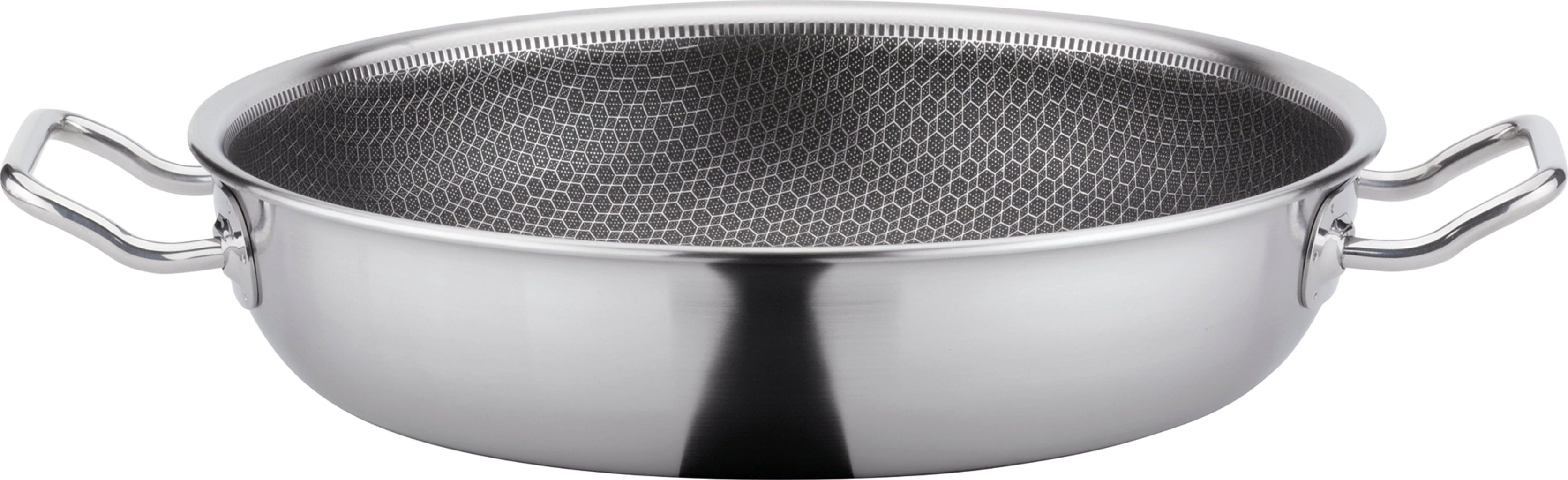 Med serveringspanna Vulcano Cut Resist Pure XL från Spring får du teknisk precision i köket! Det 5-lagersmaterialet med tredubbel aluminiumkärna ger snabb och jämn värmefördelning ända upp till kanten. Den upphöjda bikakestrukturen i rostfritt stål skyddar den mineraliska non stick-beläggningen, vilket gör att du kan använda även metallredskap.