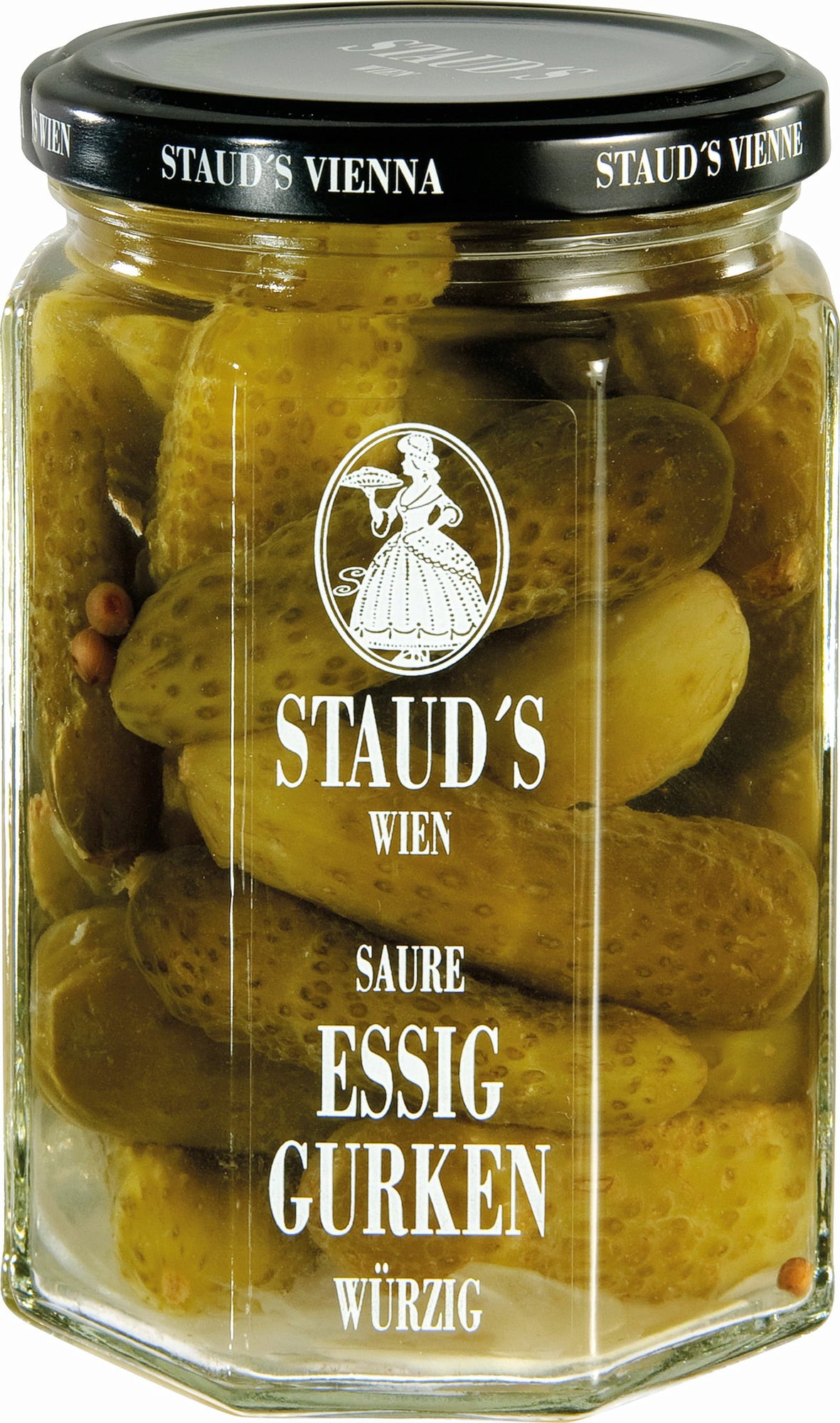 Gurka, Weingeistessig (ren jäsningsvinäger), Zucker, Gewürze, Örter, Zwiebel, Pepparrot, Peppar