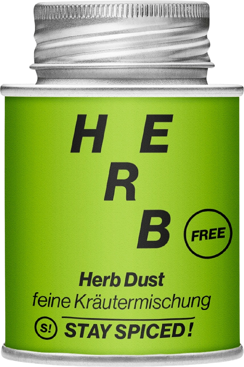 Denna kryddblandning är utan salt, lök och vitlök men ändå en riktig smakexplosion! FREE Herb Dust från Stay Spiced! med tio olika torkade örter - bland annat persilja, vild vitlök och timjan - är den perfekta kryddblandningen för aromatiska marinader. Jalapeño chili, ingefära och asafetida ger en kryddig smaksensation.