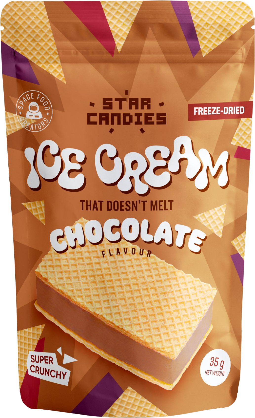 Upptäck STAR CANDIES frystorkade glassandwich med chokladsmak från Supergarden! Det här innovativa desserten är faktiskt en glass – som inte smälter! Föreställ dig smaken av din favoritglass med choklad, men alltid krispig och redo att ätas – helt utan frys!