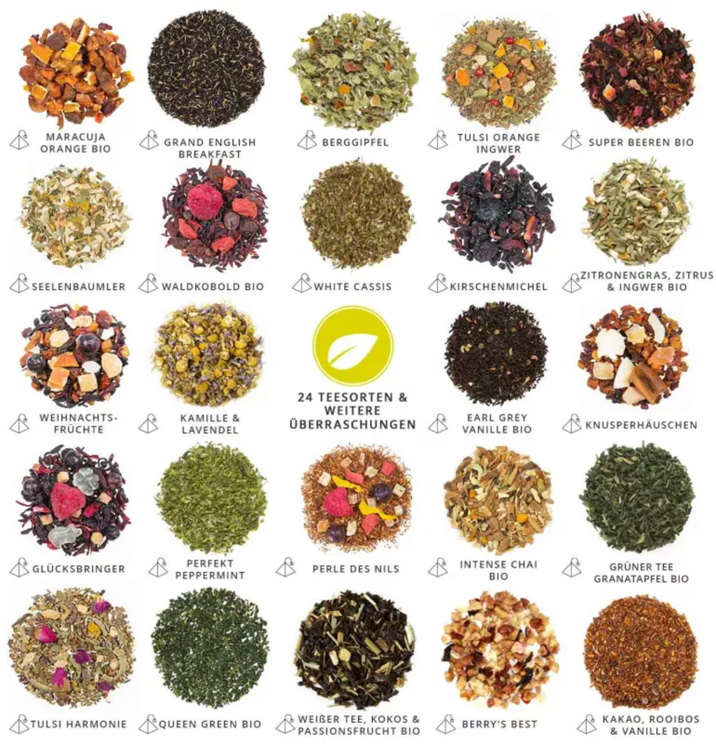 Följ med på en spännande resa genom tevärlden och upptäck högkvalitativa teblandningar i stora pyramidpåsar. Varje påse räcker till en stor kopp te eller en liten tekanna. Njut av 24 dagar fulla av smaker och se fram emot ytterligare 5 överraskningar som den här kalendern har i beredskap för dig.